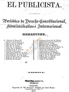 “SECCIÓN PRIMERA (editorial): Cuestiones prácticas de derecho mexicano administrativo, constitucional e internacional, resultante de los tratados y convenciones. Principios de legislación, historia y filosofía de nuestra jurisprudencia, y de la extranjera”.