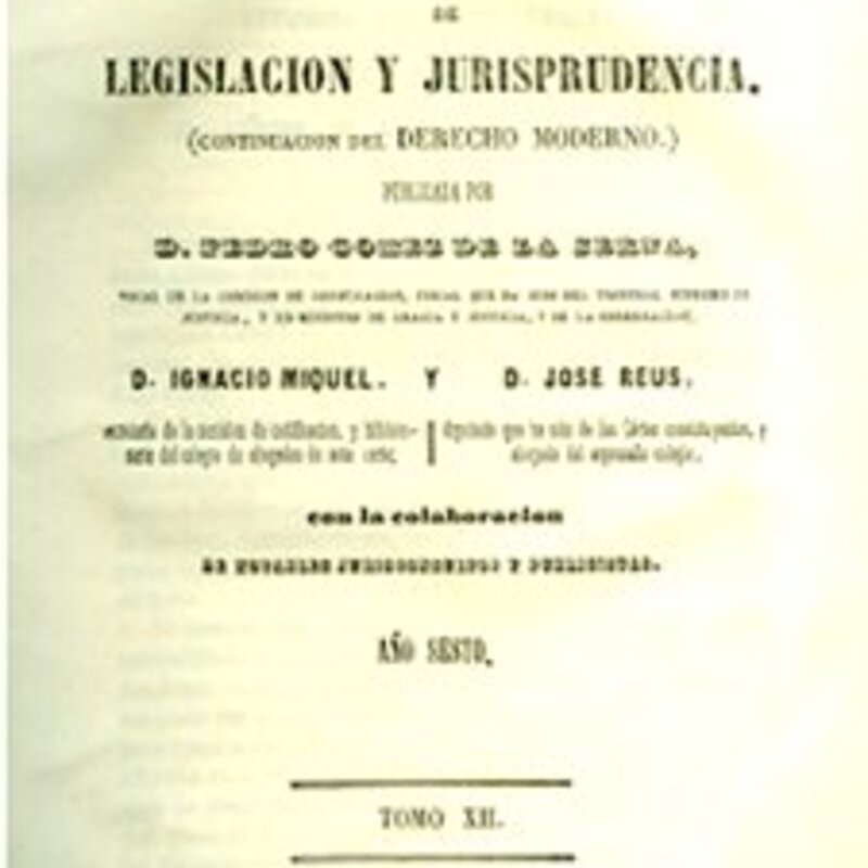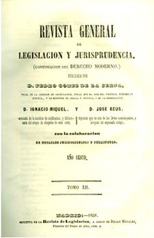 1853 fue un año importante para la prensa jurídica española. José Reus e Ignacio Miquel fundaron la Revista General de Legislación y Jurisprudencia (en adelante Revista General), una de las protagonistas centrales de la historia de la prensa jurídica española. En Madrid, empleando la Imprenta de Díaz y Compañía, se dio inicio entonces a la que puede ser denominada con justicia la decana o la revista más relevante en la historia de la prensa jurídica española por la diversidad de autores, épocas, materias y tendencias que acogió. Creo que diferentes épocas de la Revista General han sido adecuadamente estudiadas por lo que basta acudir a tal literatura citada infra, aunque a mi juicio está pendiente un estudio global que abarque todos sus proyectos, personajes y épocas. Sus fundadores José Reus García (1816-1883) e Ignacio Miquel Rubert (1825-1858) eran dos juristas alicantinos que tenían perfiles diferentes. De Reus se puede decir que era más periodista, empresario y político; había fundado antes un periódico (La Tribuna), fue diputado y senador, y sobre todo puso en marcha una empresa editorial se duraría muchas décadas. Miquel tenía un perfil más académico, como bibliotecario del Colegio de Abogados de Madrid y su fallecimiento temprano impidió la producción de más obras jurídicas.