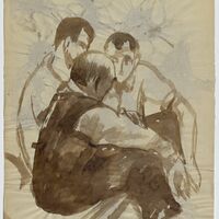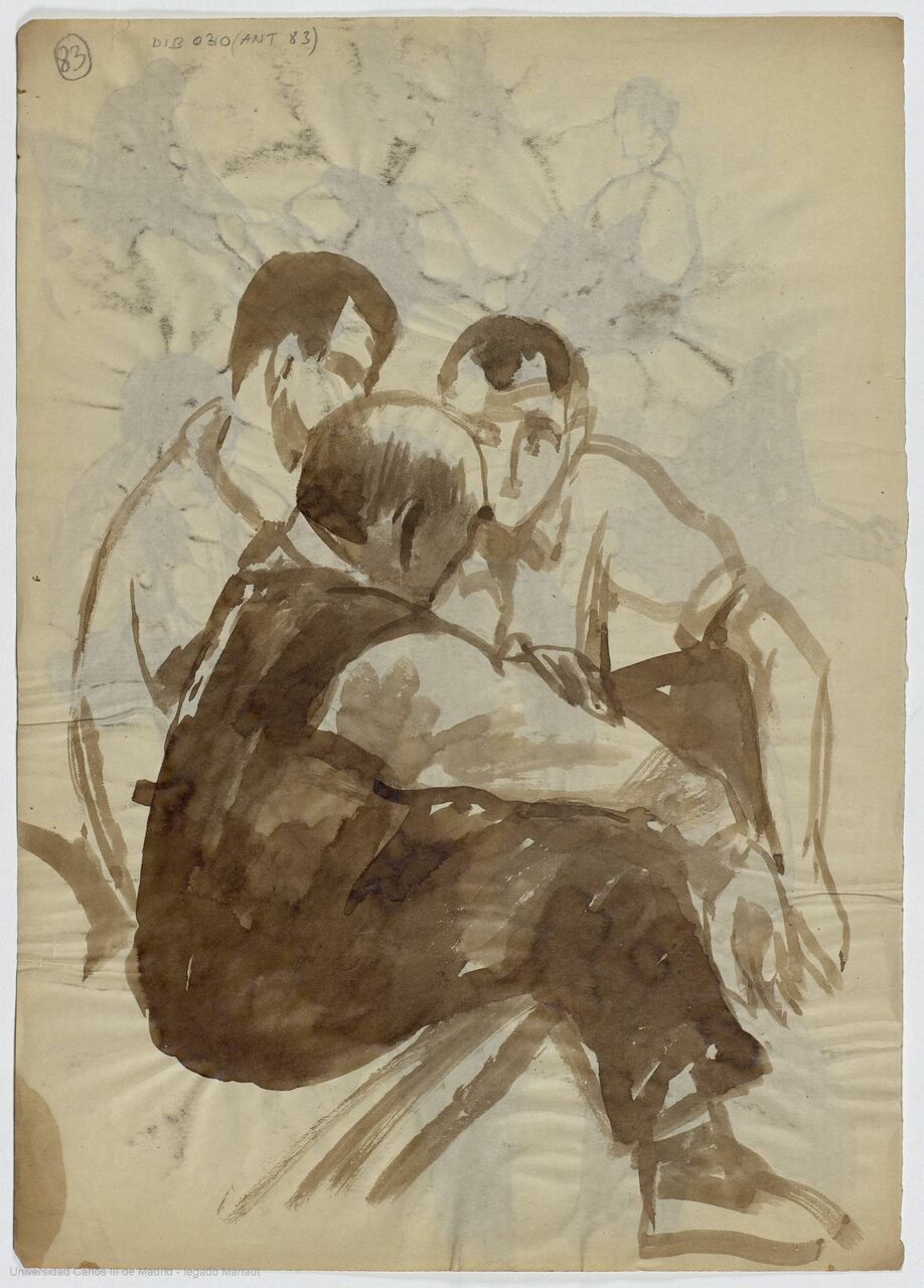 TRES SENTADOS, CHARLANDO - Aguada sepia - 23 x 32 cm - REVERSO: Varios haciendo algo, apenas definidos - Aguada sepia
