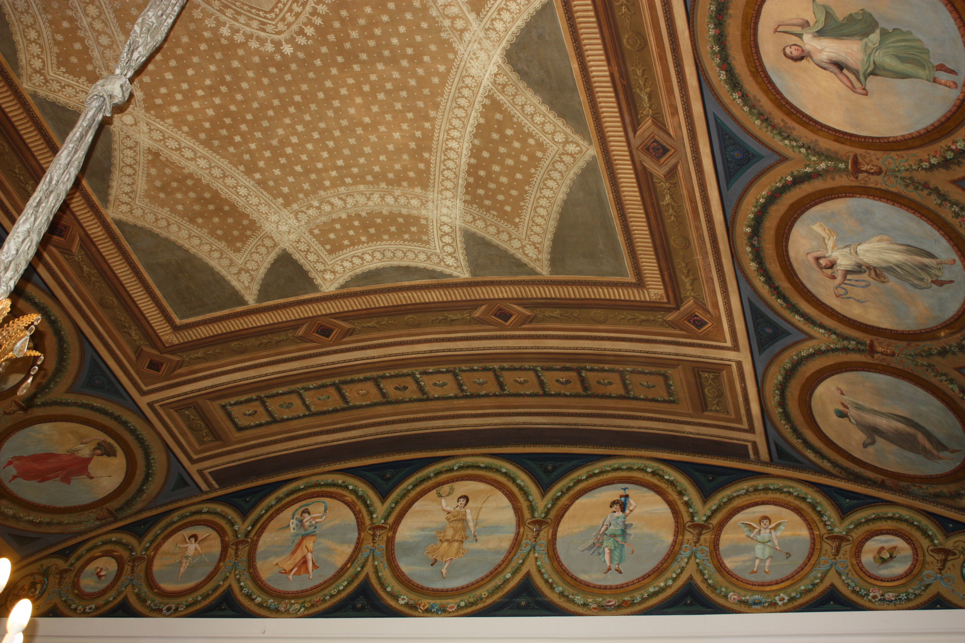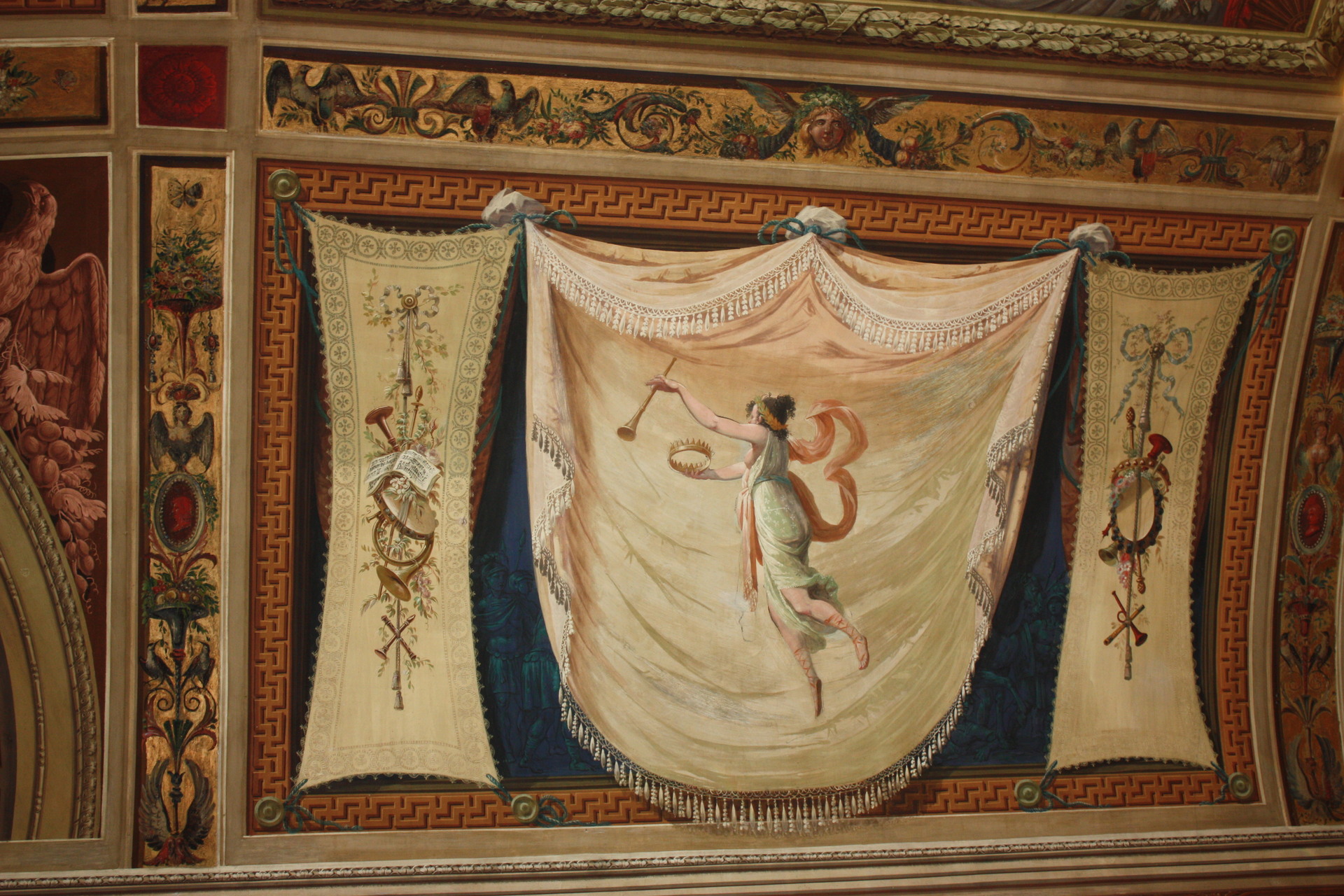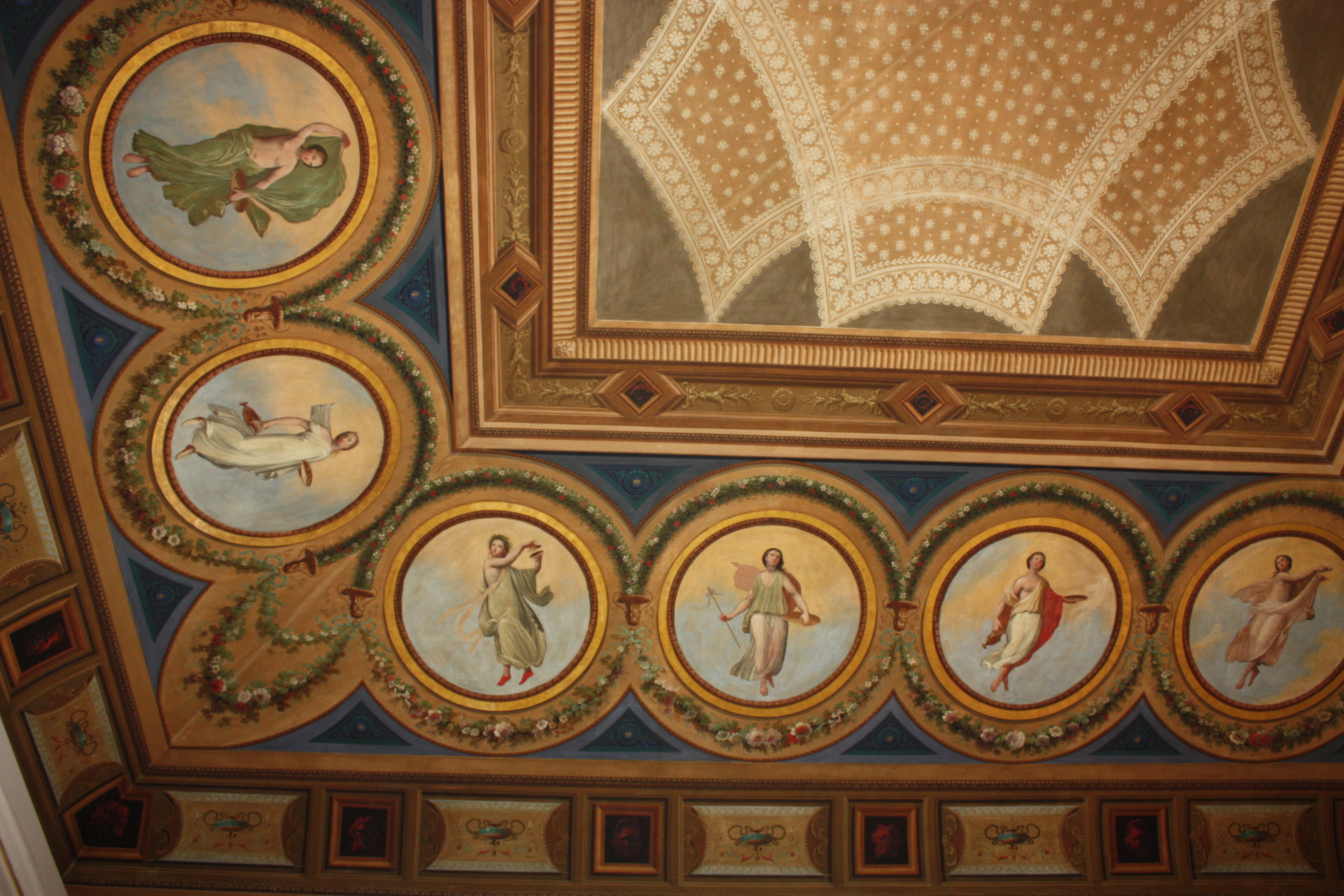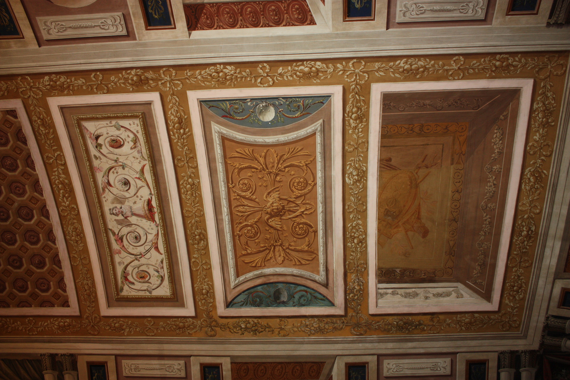 No sabemos con exactitud quiénes fueron los autores de las pinturas de estilo pompeyano del Palacio de Buenavista, pero sí sabemos que este estilo tuvo un Impacto importante, porque lo encontramos en varios salones. Uno de ellos es el Salón Goya, conocido con este nombre, que alberga quince tapices realizados a partir de dibujos animados del célebre pintor. Guirnaldas de flores, coronas de laurel, palmetas, cupidos y animales fantásticos de apariencia clásica se insertaron en el programa decorativo del techo de este salón. Más evidentes son los motivos pompeyanos en el Despacho de Audiencias. Enmarcadas por columnas unidas con cortinas y trípodes con flores, se representaron escenas inspiradas en los grabados de Antichità. Una distribución similar también tuvo lugar en el Salón de Embajadores, con columnas, decoraciones vegetales de estilo pompeyano y con un casco y un penacho más suave en la cabeza. En el Salón Don Quijote - decorado con tapices que representan escenas de la famosa obra de Miguel de Cervantes - en su lugar se utilizaron los bailarines de pinturas pompeyanas. Daban la impresión de volar dentro de círculos rodeados de guirnaldas de flores, que brotaban de jarrones. Una especie de encaje ocupaba el panel central, separado de los bailarines mediante un friso con decoración vegetal y geométrica, flanqueado a su vez por otros cortinajes con adornos florales. El estilo del techo de esta sala, que termina con un panel central con jarrones y cupidos, ha sido comparado con el estilo de Japelli: sin embargo, es muy probable que sea una composición que intentó imitar el estilo de este decorador y que se completó a mediados del siglo XIX. Por último, es necesario mencionar el Salón de Porcelanas, en cuyo techo se creó un friso de estilo pompeyano con volutas vegetales que brotaron de los brazos de figuras aladas y cuatro medallones en las esquinas con cupidos con instrumentos que aluden a la astronomía y la navegación. - Detalles de conservación y restauración