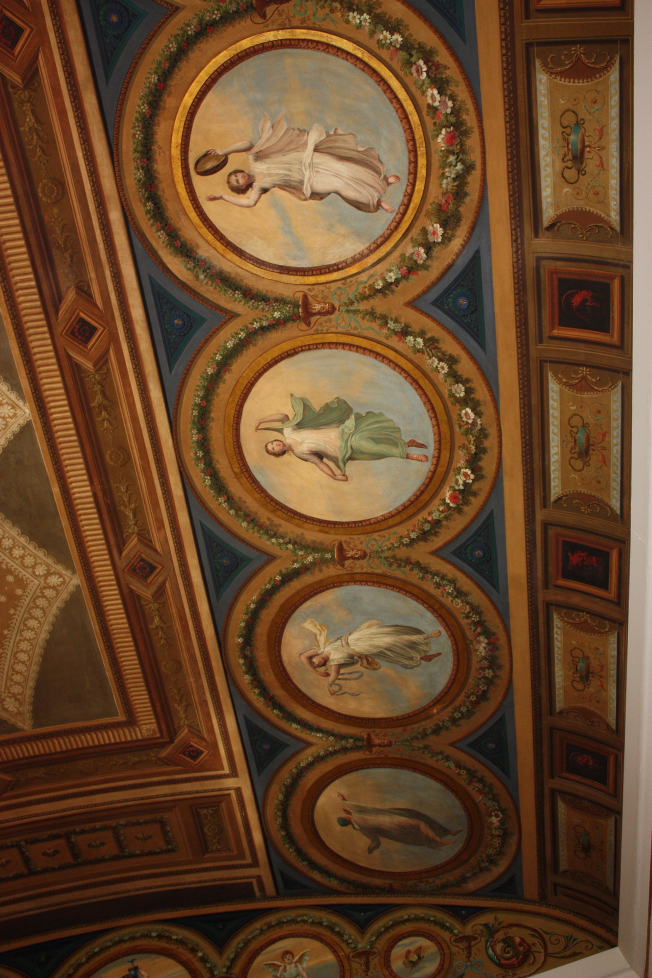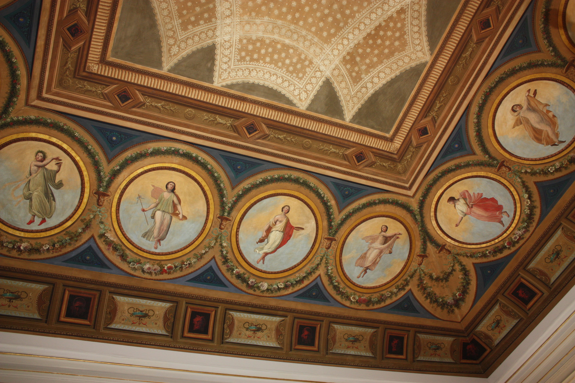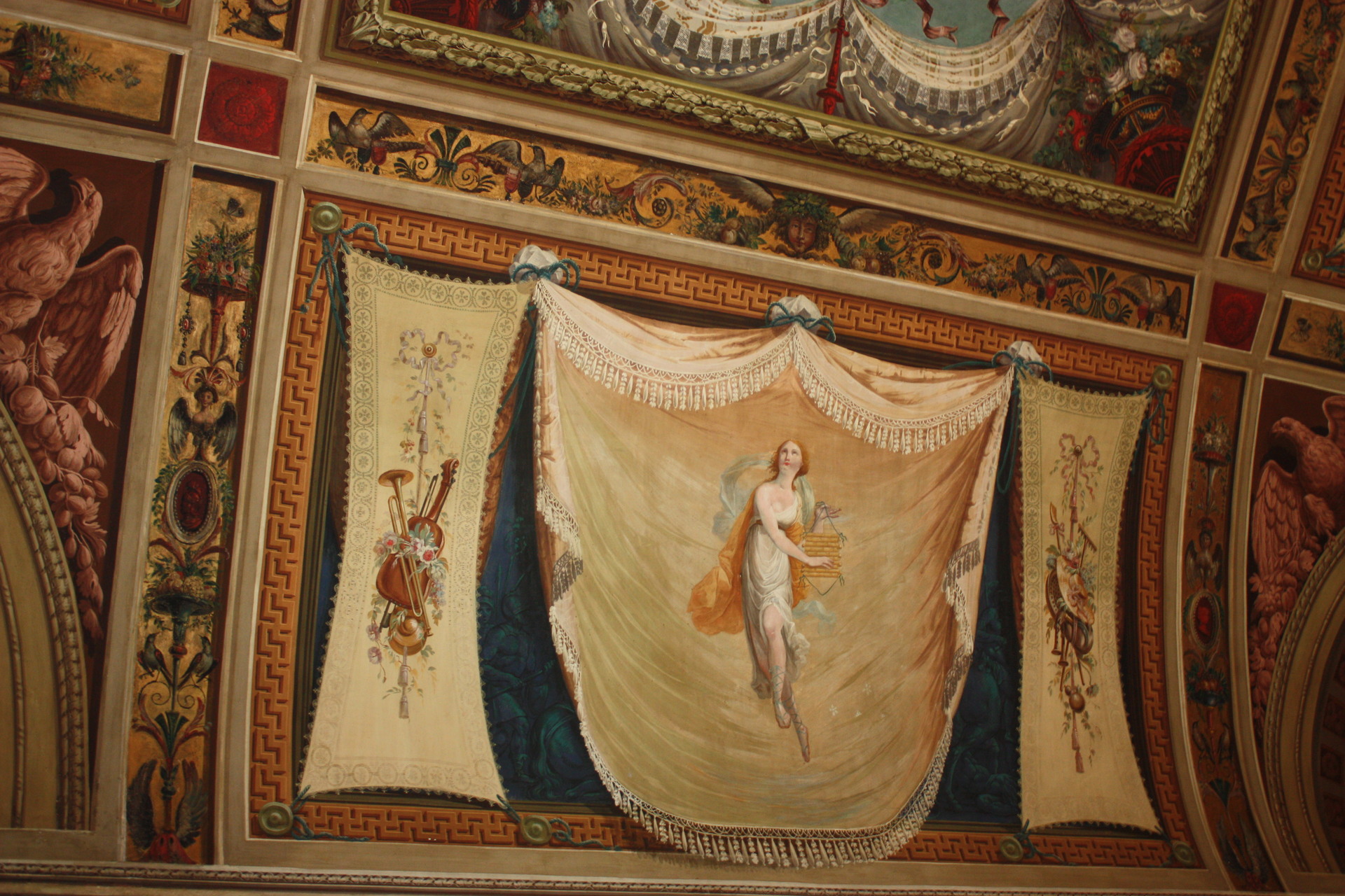 No sabemos con exactitud quiénes fueron los autores de las pinturas de estilo pompeyano del Palacio de Buenavista, pero sí sabemos que este estilo tuvo un Impacto importante, porque lo encontramos en varios salones. Uno de ellos es el Salón Goya, conocido con este nombre, que alberga quince tapices realizados a partir de dibujos animados del célebre pintor. Guirnaldas de flores, coronas de laurel, palmetas, cupidos y animales fantásticos de apariencia clásica se insertaron en el programa decorativo del techo de este salón. Más evidentes son los motivos pompeyanos en el Despacho de Audiencias. Enmarcadas por columnas unidas con cortinas y trípodes con flores, se representaron escenas inspiradas en los grabados de Antichità. Una distribución similar también tuvo lugar en el Salón de Embajadores, con columnas, decoraciones vegetales de estilo pompeyano y con un casco y un penacho más suave en la cabeza. En el Salón Don Quijote - decorado con tapices que representan escenas de la famosa obra de Miguel de Cervantes - en su lugar se utilizaron los bailarines de pinturas pompeyanas. Daban la impresión de volar dentro de círculos rodeados de guirnaldas de flores, que brotaban de jarrones. Una especie de encaje ocupaba el panel central, separado de los bailarines mediante un friso con decoración vegetal y geométrica, flanqueado a su vez por otros cortinajes con adornos florales. El estilo del techo de esta sala, que termina con un panel central con jarrones y cupidos, ha sido comparado con el estilo de Japelli: sin embargo, es muy probable que sea una composición que intentó imitar el estilo de este decorador y que se completó a mediados del siglo XIX. Por último, es necesario mencionar el Salón de Porcelanas, en cuyo techo se creó un friso de estilo pompeyano con volutas vegetales que brotaron de los brazos de figuras aladas y cuatro medallones en las esquinas con cupidos con instrumentos que aluden a la astronomía y la navegación. - Detalles de conservación y restauración