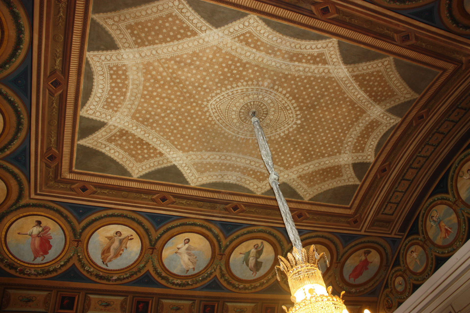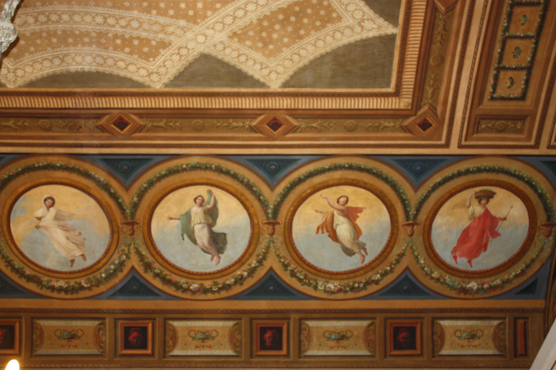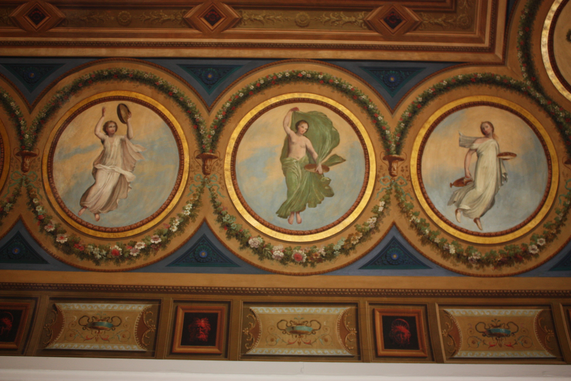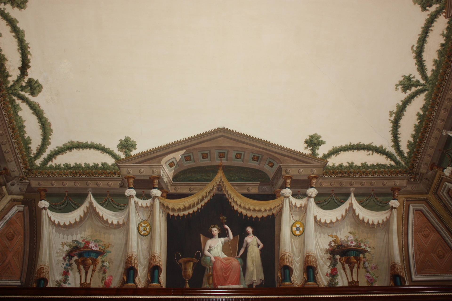 No sabemos con exactitud quiénes fueron los autores de las pinturas de estilo pompeyano del Palacio de Buenavista, pero sí sabemos que este estilo tuvo un Impacto importante, porque lo encontramos en varios salones. Uno de ellos es el Salón Goya, conocido con este nombre, que alberga quince tapices realizados a partir de dibujos animados del célebre pintor. Guirnaldas de flores, coronas de laurel, palmetas, cupidos y animales fantásticos de apariencia clásica se insertaron en el programa decorativo del techo de este salón. Más evidentes son los motivos pompeyanos en el Despacho de Audiencias. Enmarcadas por columnas unidas con cortinas y trípodes con flores, se representaron escenas inspiradas en los grabados de Antichità. Una distribución similar también tuvo lugar en el Salón de Embajadores, con columnas, decoraciones vegetales de estilo pompeyano y con un casco y un penacho más suave en la cabeza. En el Salón Don Quijote - decorado con tapices que representan escenas de la famosa obra de Miguel de Cervantes - en su lugar se utilizaron los bailarines de pinturas pompeyanas. Daban la impresión de volar dentro de círculos rodeados de guirnaldas de flores, que brotaban de jarrones. Una especie de encaje ocupaba el panel central, separado de los bailarines mediante un friso con decoración vegetal y geométrica, flanqueado a su vez por otros cortinajes con adornos florales. El estilo del techo de esta sala, que termina con un panel central con jarrones y cupidos, ha sido comparado con el estilo de Japelli: sin embargo, es muy probable que sea una composición que intentó imitar el estilo de este decorador y que se completó a mediados del siglo XIX. Por último, es necesario mencionar el Salón de Porcelanas, en cuyo techo se creó un friso de estilo pompeyano con volutas vegetales que brotaron de los brazos de figuras aladas y cuatro medallones en las esquinas con cupidos con instrumentos que aluden a la astronomía y la navegación. - Detalles de conservación y restauración