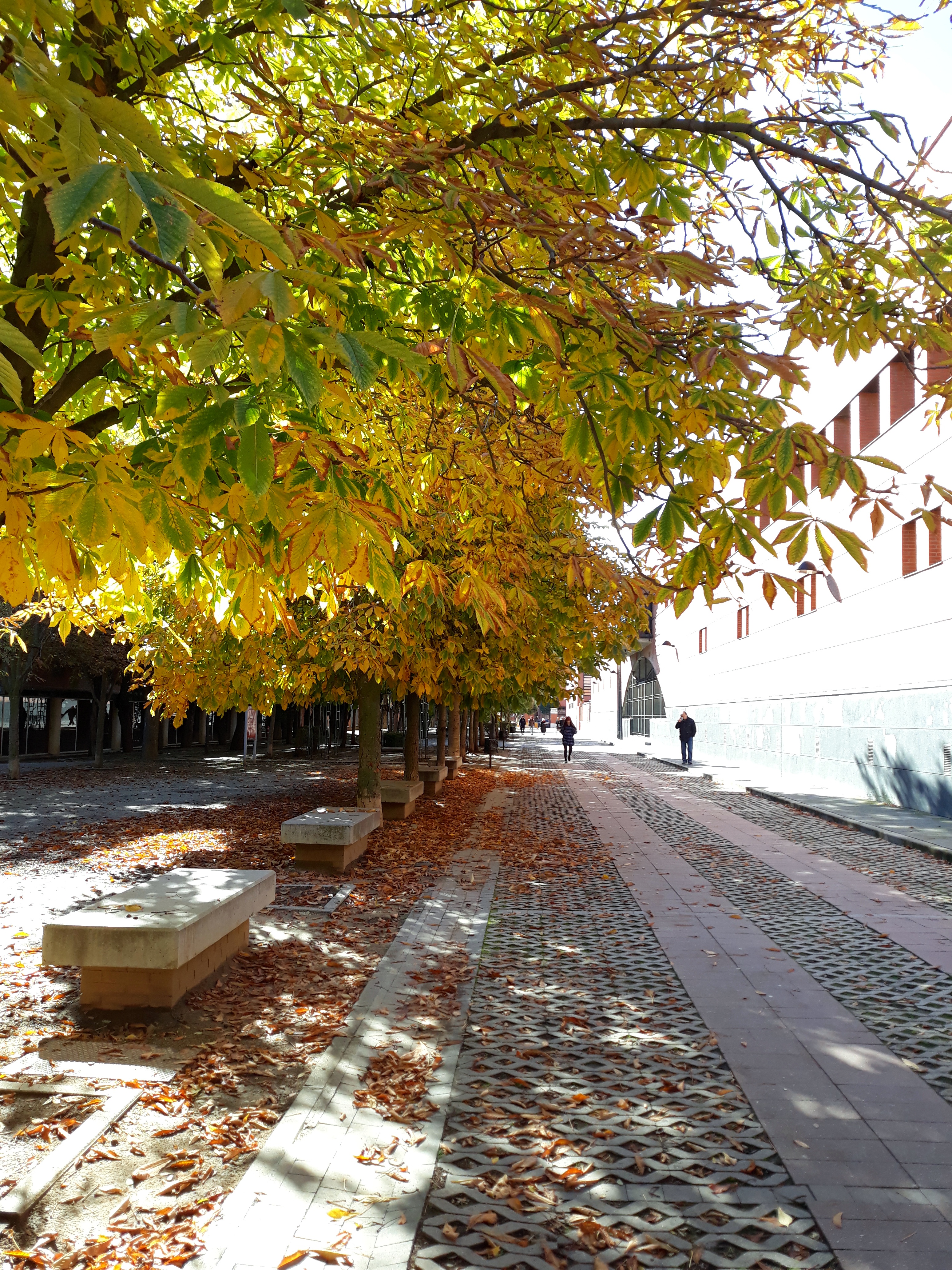 Vista del paseo lateral de la biblioteca de Ciencias Sociales y Jurídicas en otoño.