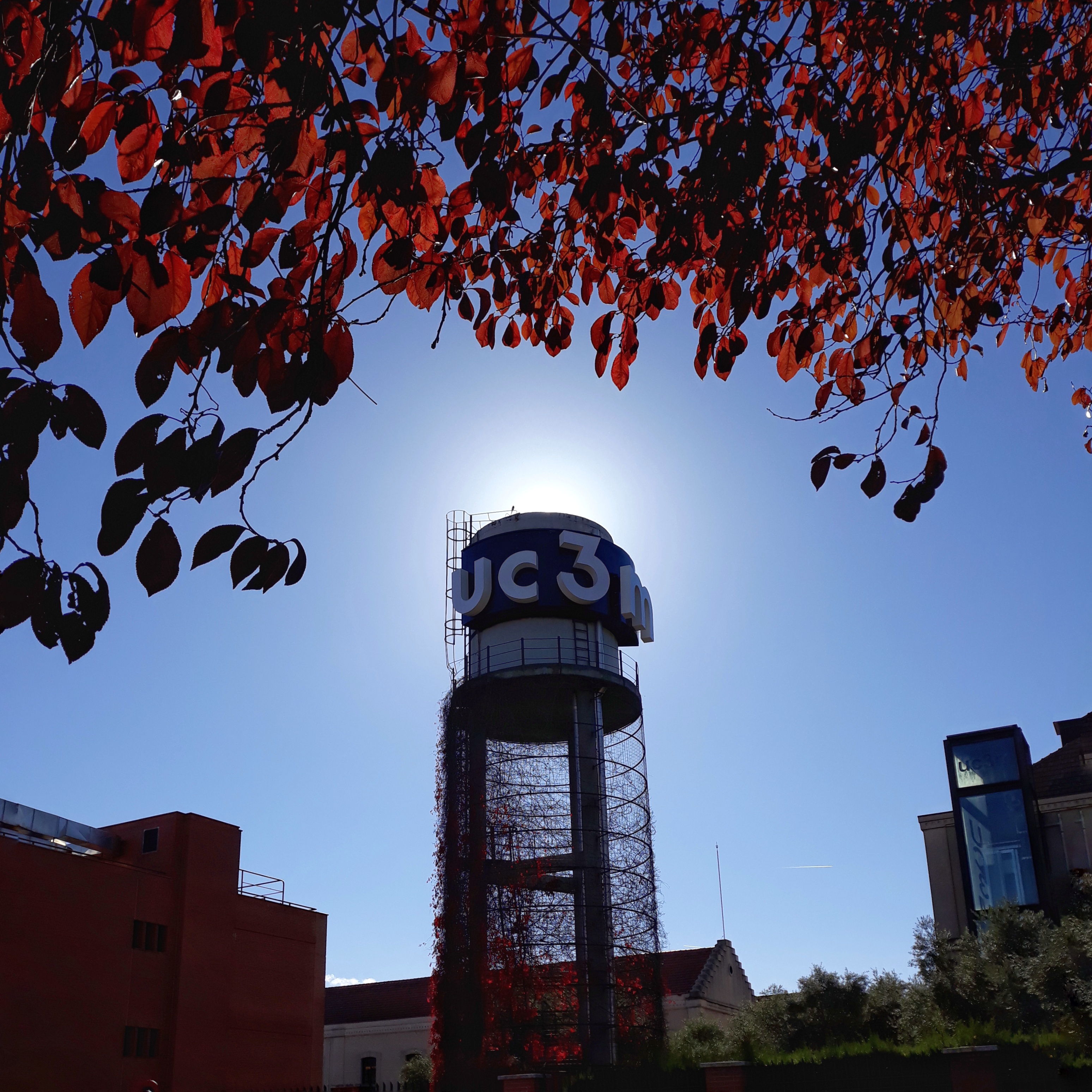 Vista de la torre del depósito de agua del campus de Getafe con el logotipo de la UC3M en otoño.