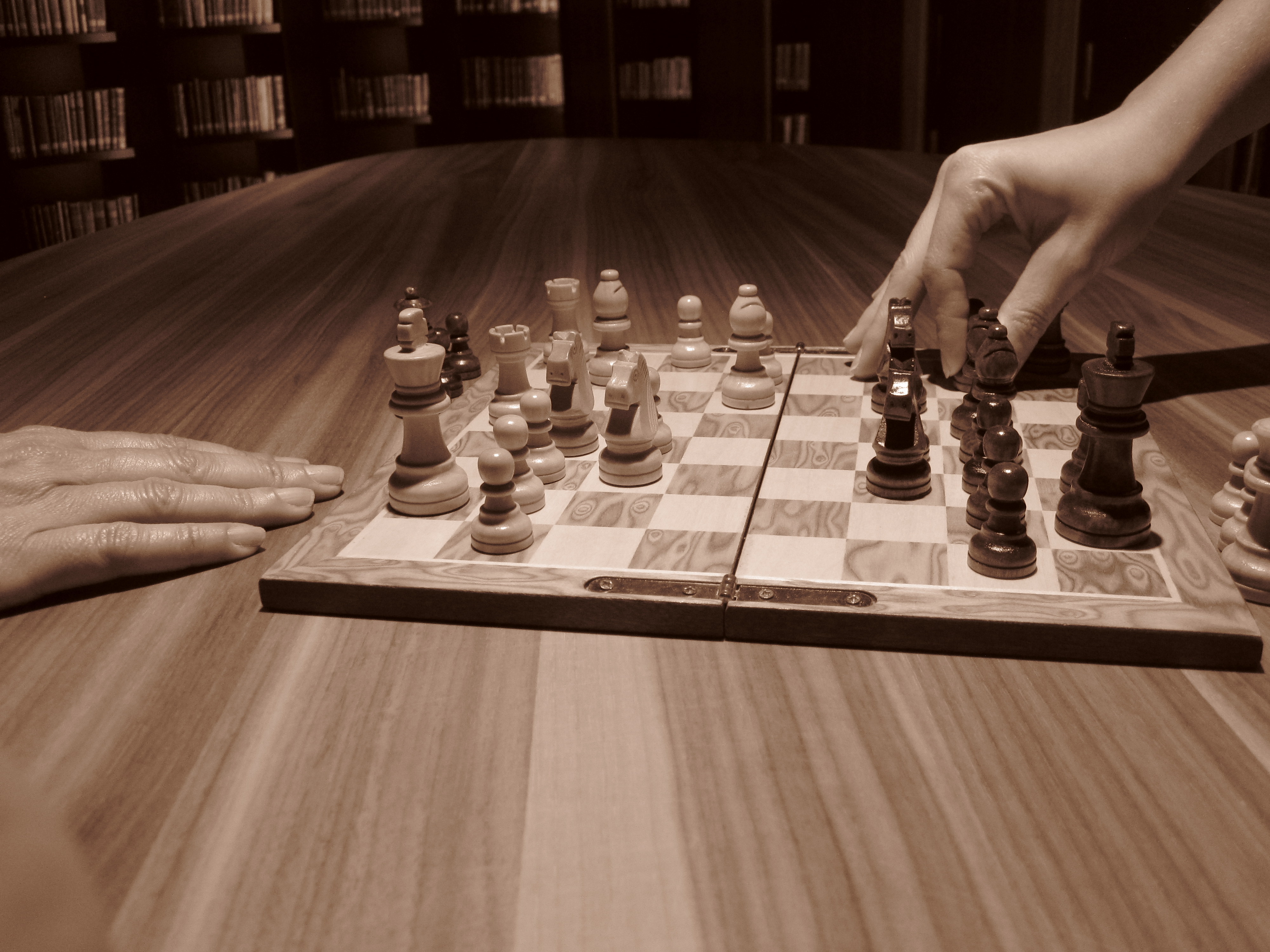 Primer plano de una mano a punto de mover una pieza de ajedrez y otra en actitud de espera. Al fondo se ven los estantes del fondo antiguo.