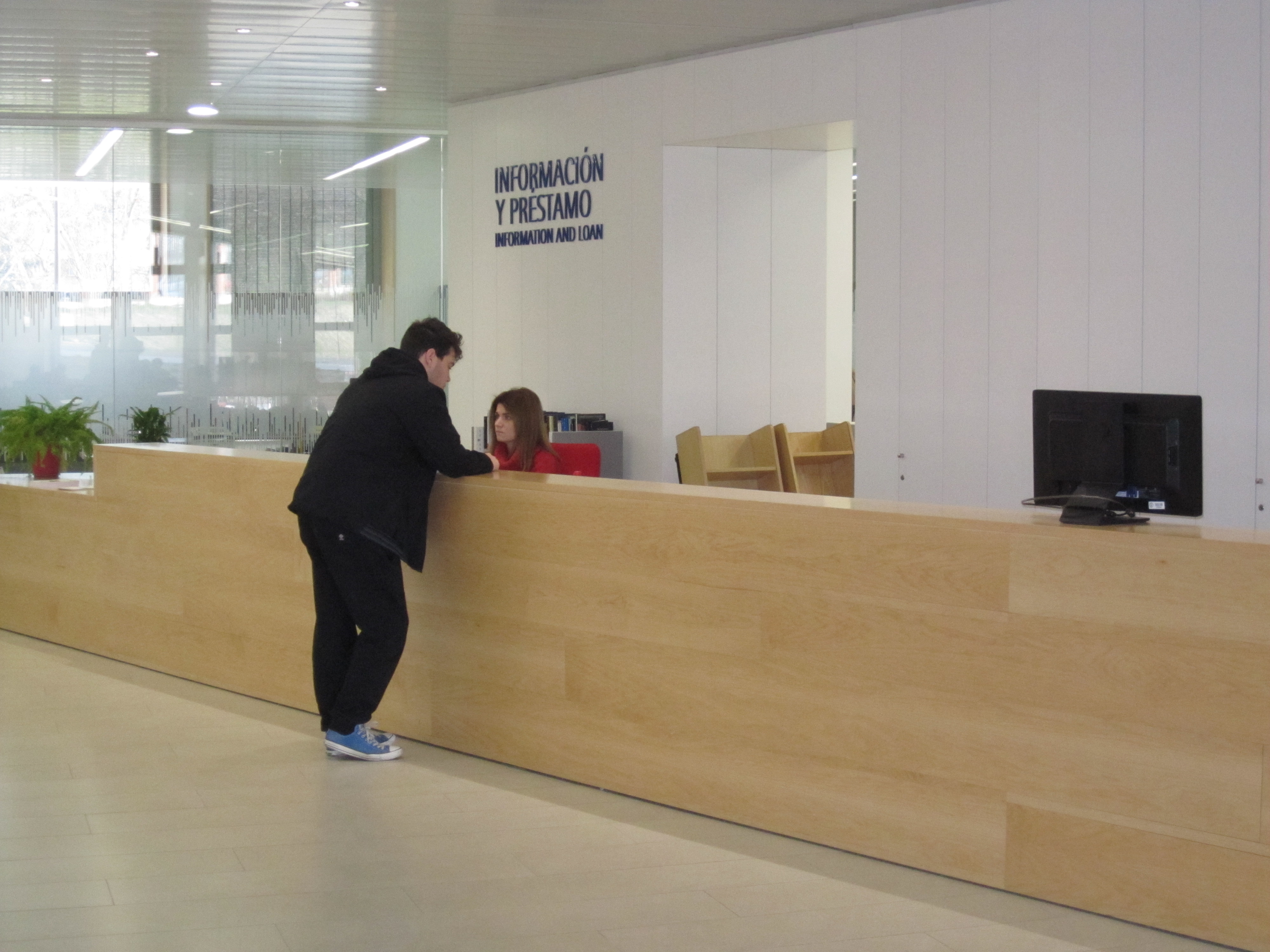 Mostrador de información y préstamo de la biblioteca de Humanidades, Comunicación y Documentación del campus de Getafe.