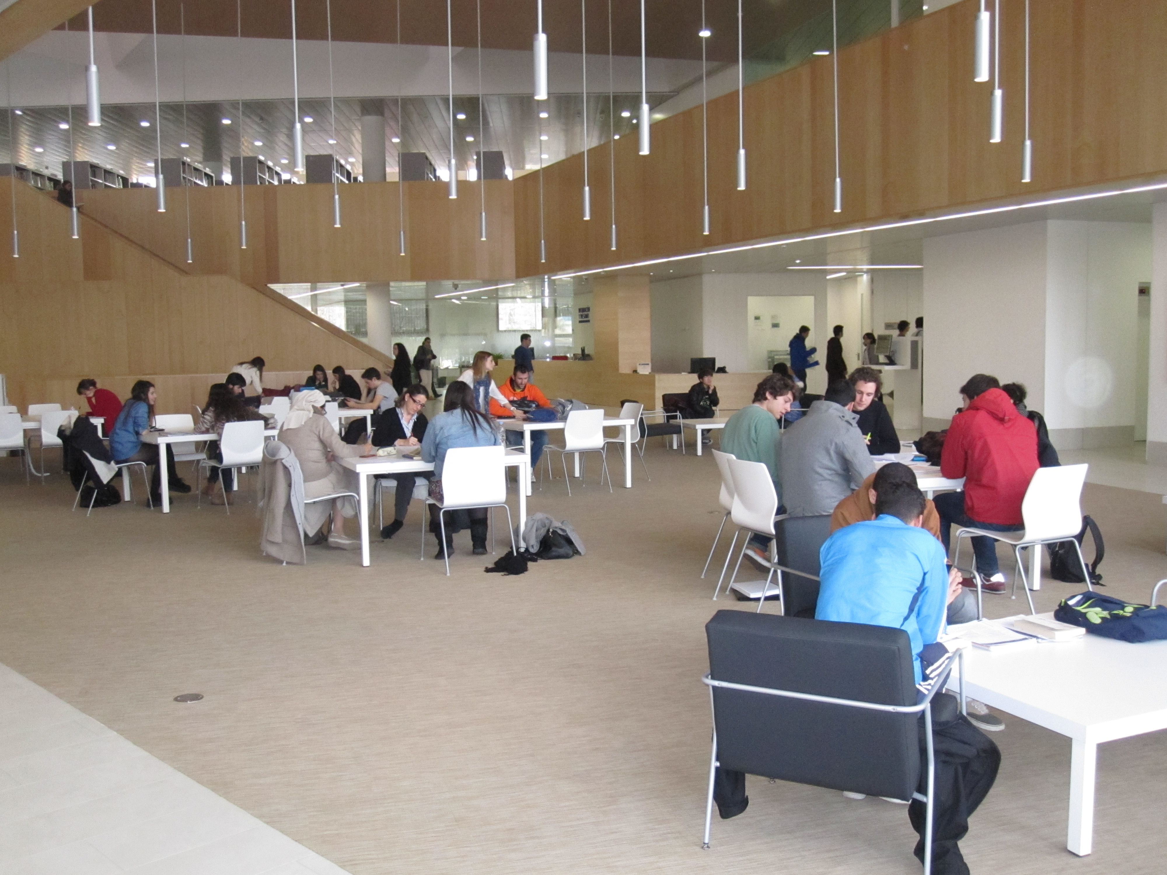 Grupos de estudiantes trabajando en la planta baja de la Biblioteca de Humanidades, Comunicación y Documentación del campus de Getafe.
