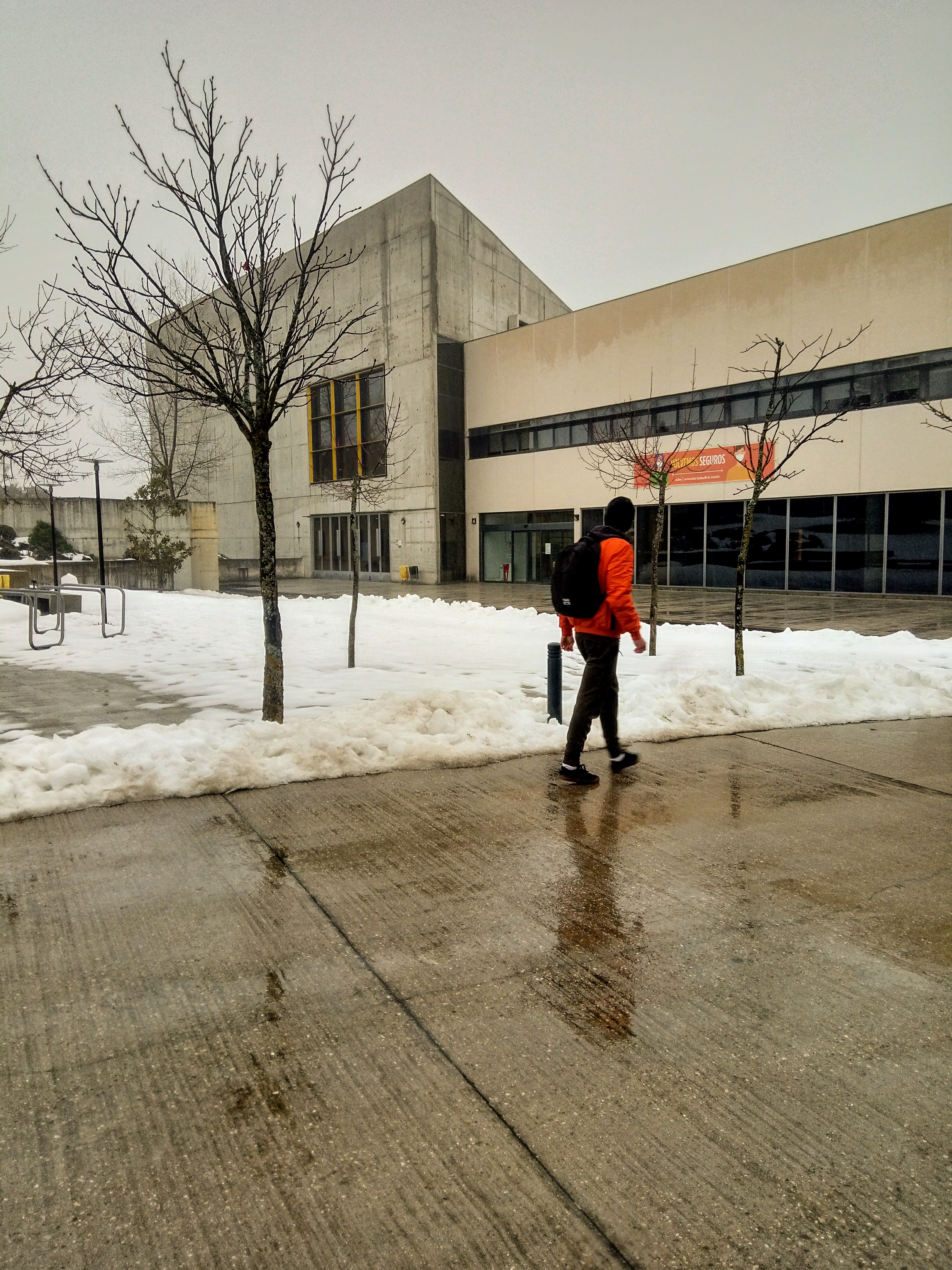 Un estudiante camina frente a la Biblioteca del Campus de Colmenarejo con nieve en el suelo.