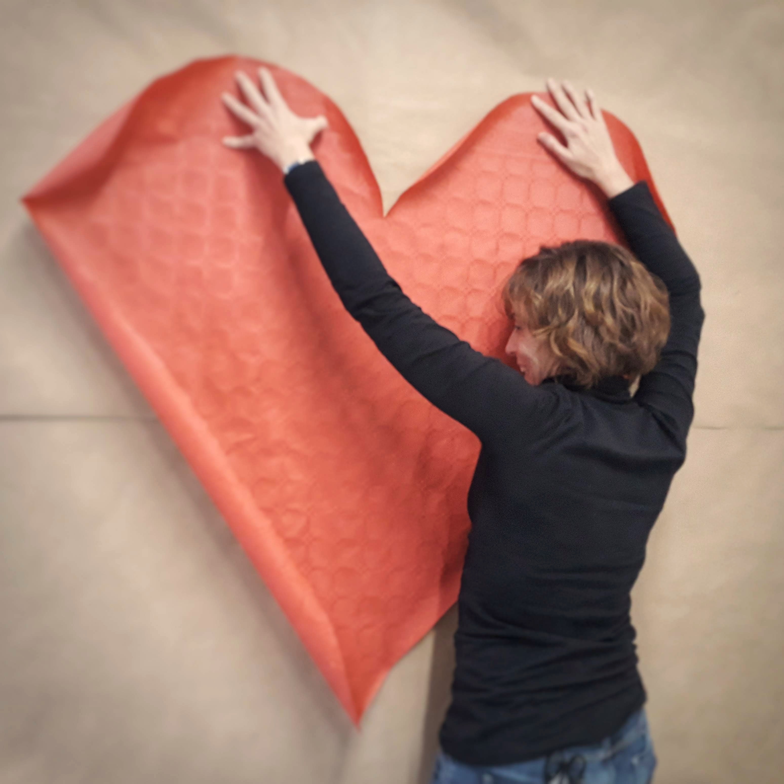 Imagen de una mujer extendiendo un corazón de papel sobre una pared.