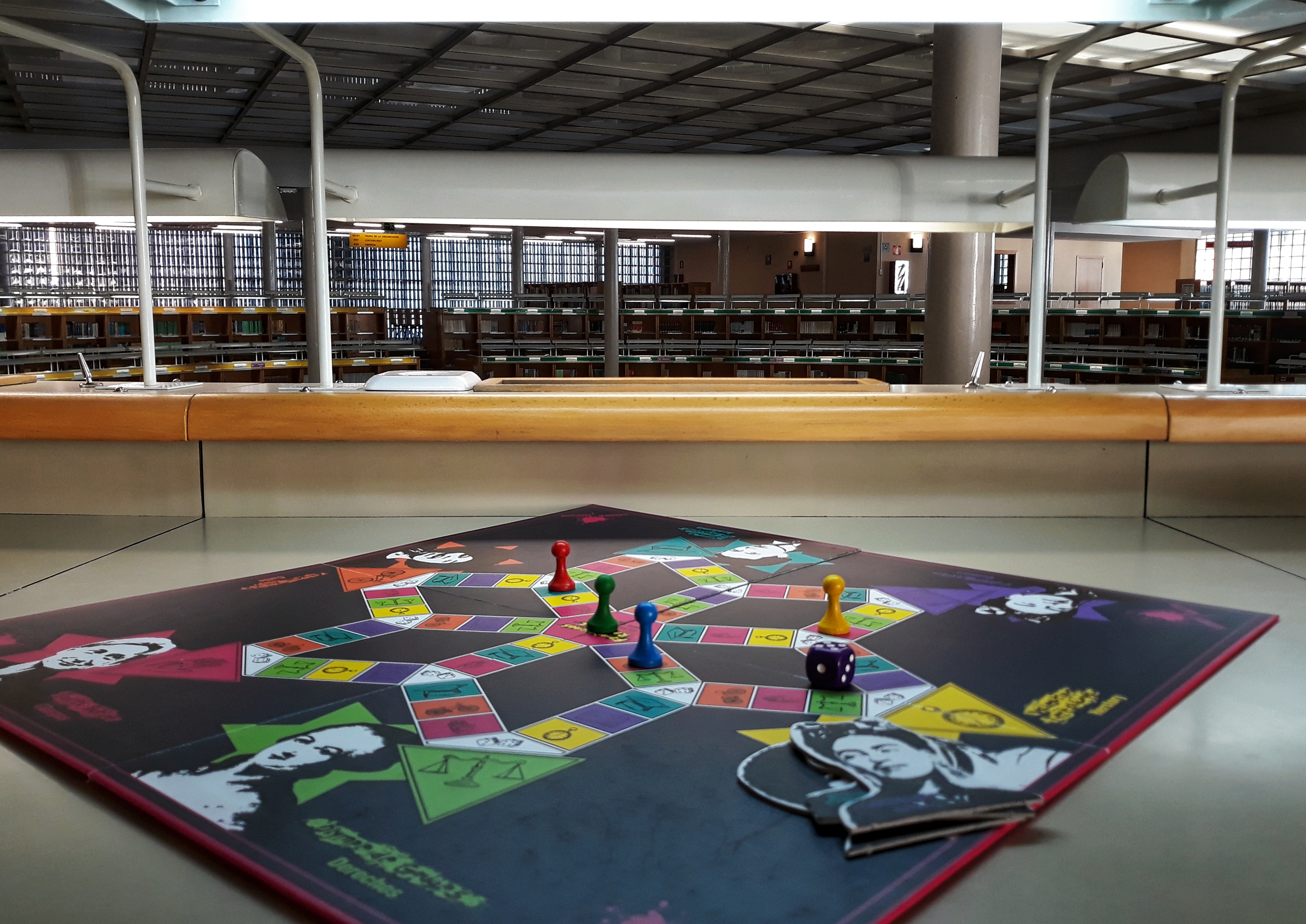 Tablero del juego de mesa Feminismos reunidos y algunas piezas en la Sala de lectura de la Biblioteca de Ciencias Sociales y Jurídicas