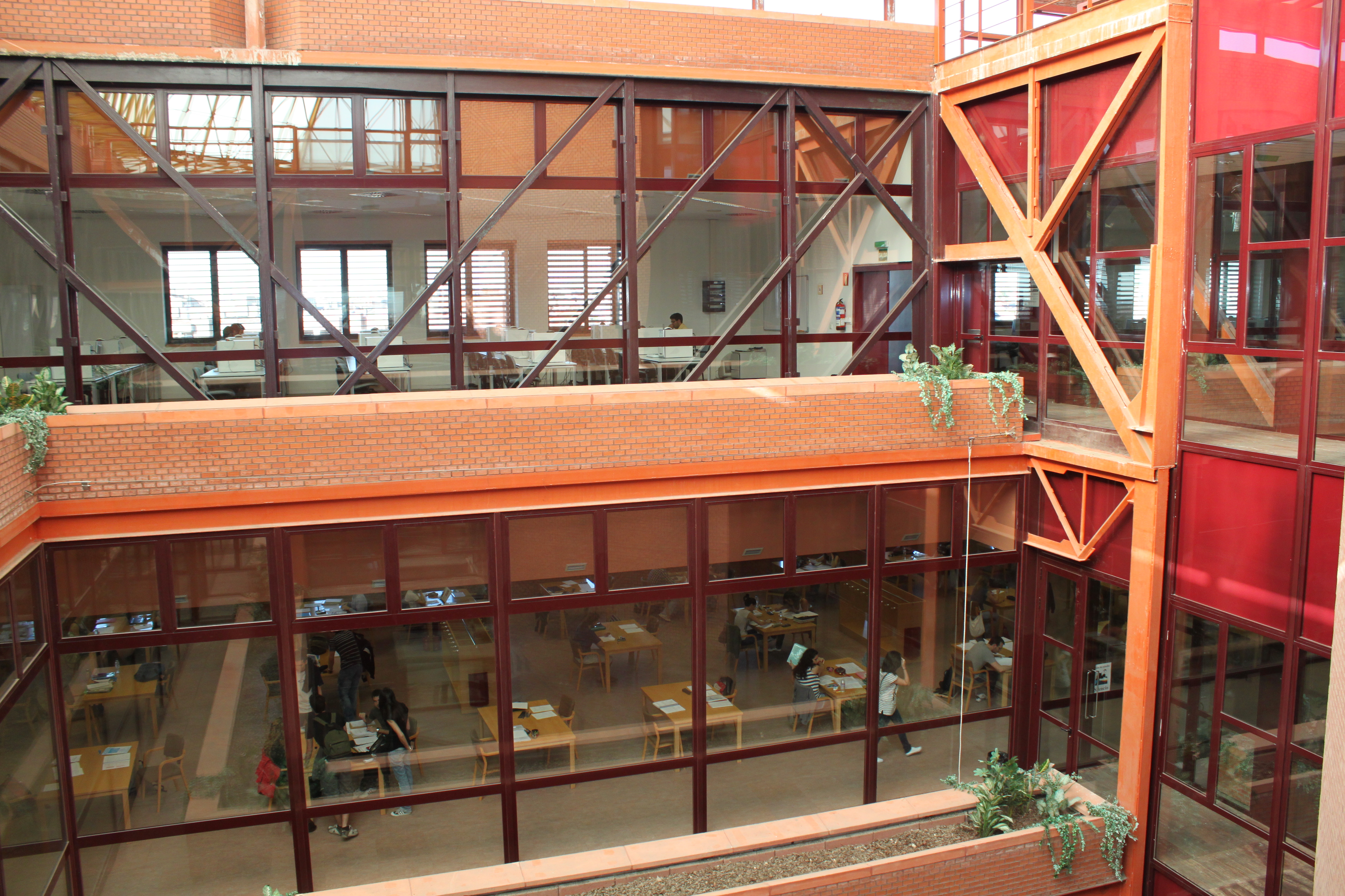 Vista del patio interior de la Biblioteca de la Escuela Politécnica Superior de Leganés, donde las estructuras metálicas enmarcan las grandes cristaleras a través de las cuales se ve la biblioteca y estudiantes.