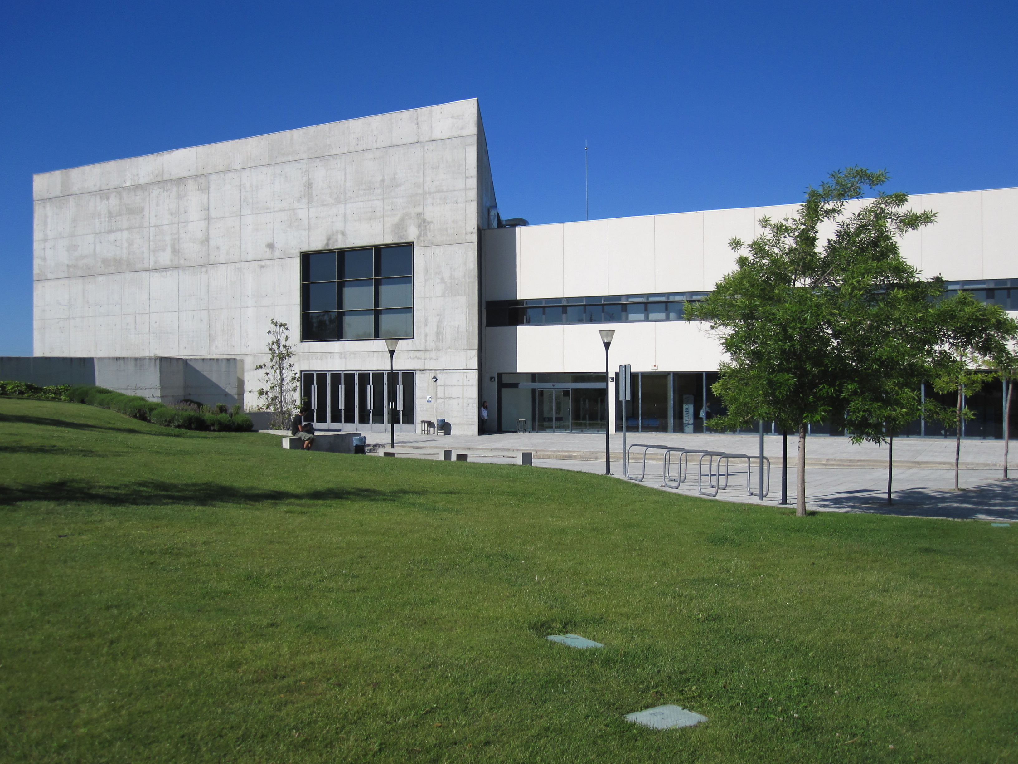 Vista de la Biblioteca del Campus de Colmenarejo en primavera, con la pradera en primer plano, un arbol a la derecha y cielo despejado.
