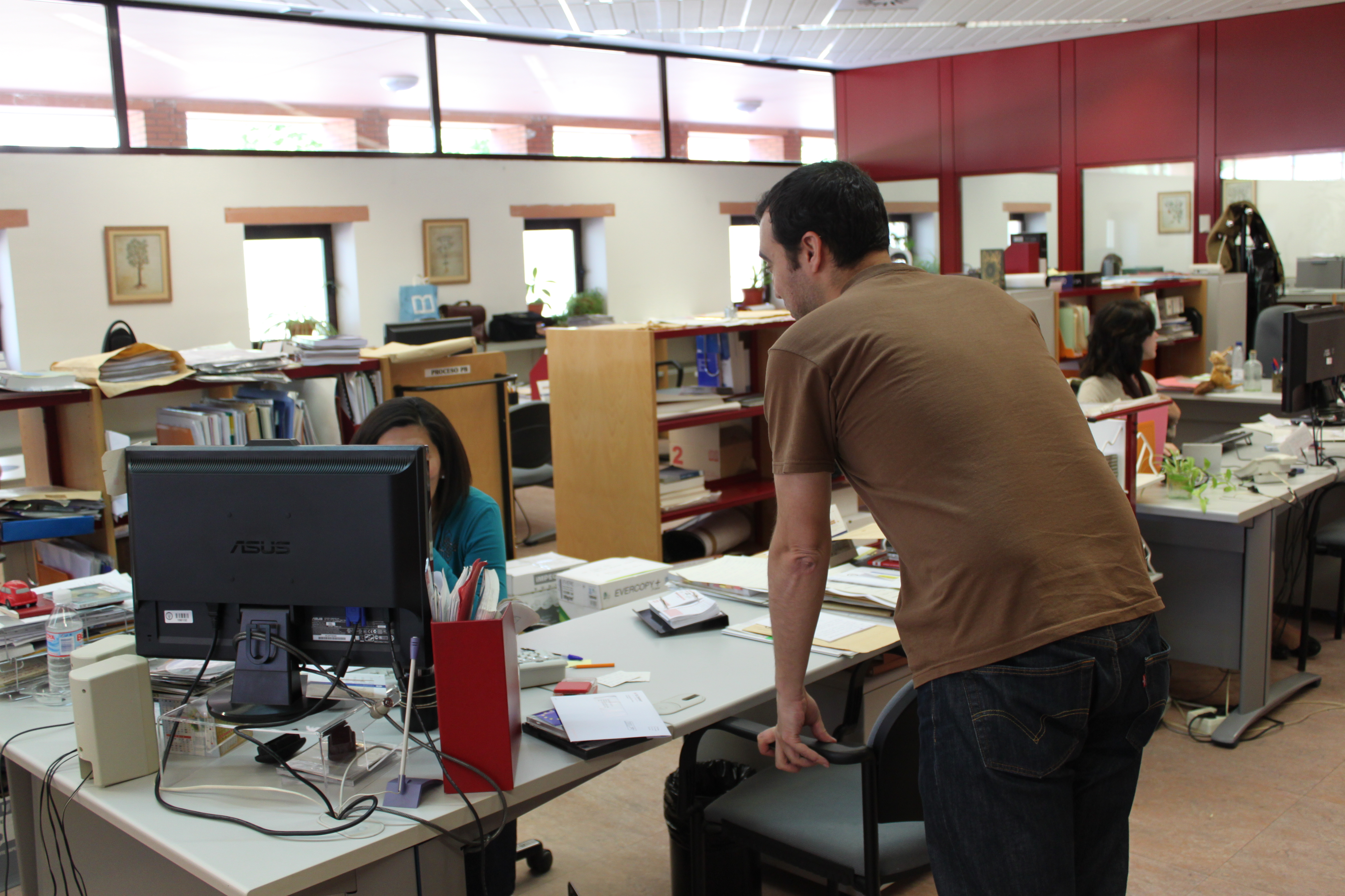 Vista del interior de la sala de Proceso Técnico e Información de la Biblioteca de la Escuela Politécnica Superior, con bibliotecarias trabajando y atendiendo a un usuario de espaldas.