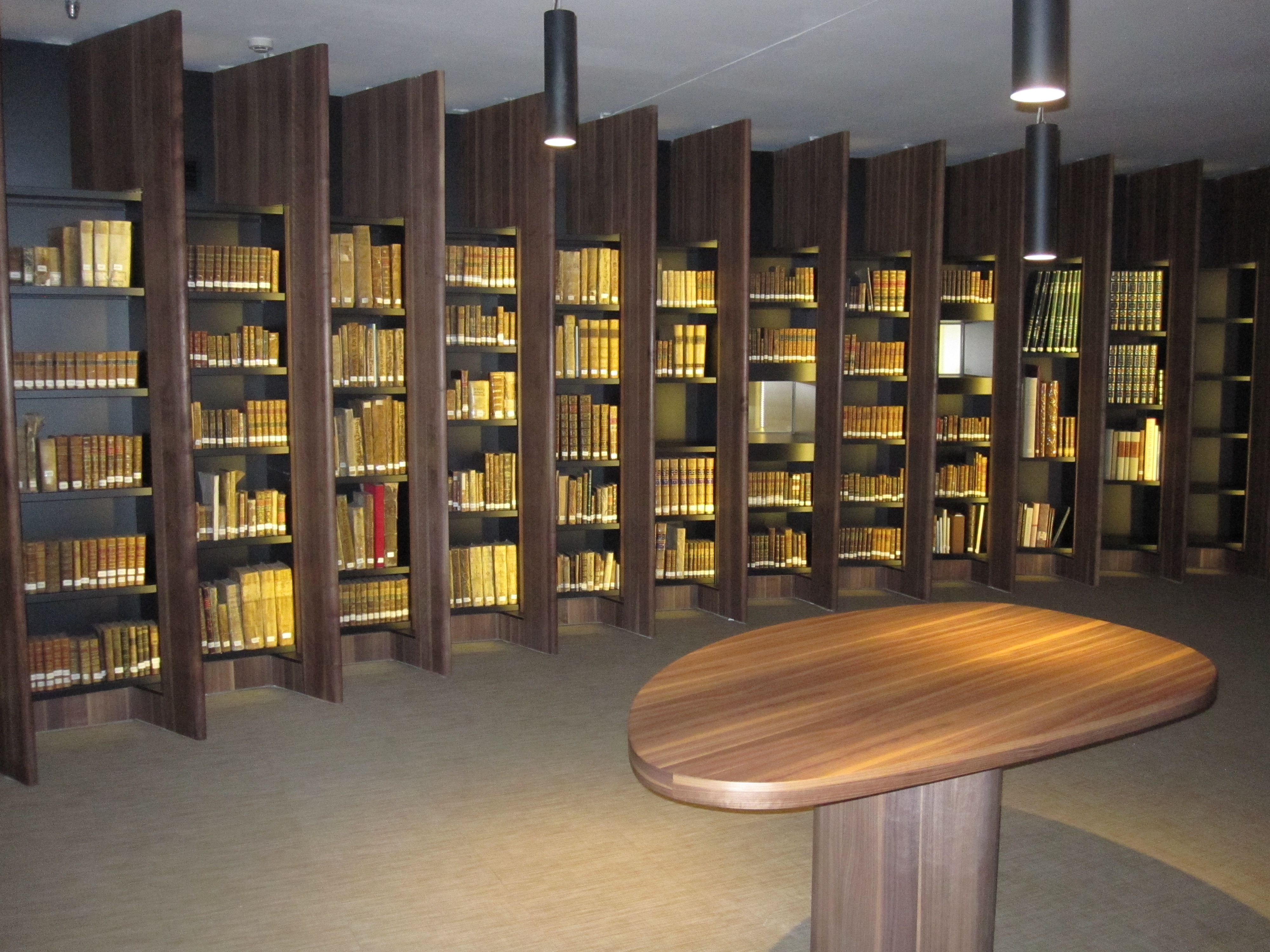Sala de Fondo Antiguo en la Biblioteca de Humanidades, Comunicación y Documentación en Getafe, iluminación tenue, lomos amarillentos de los libros antiguos en las estanterías, mesa ovalada de madera en primer término.