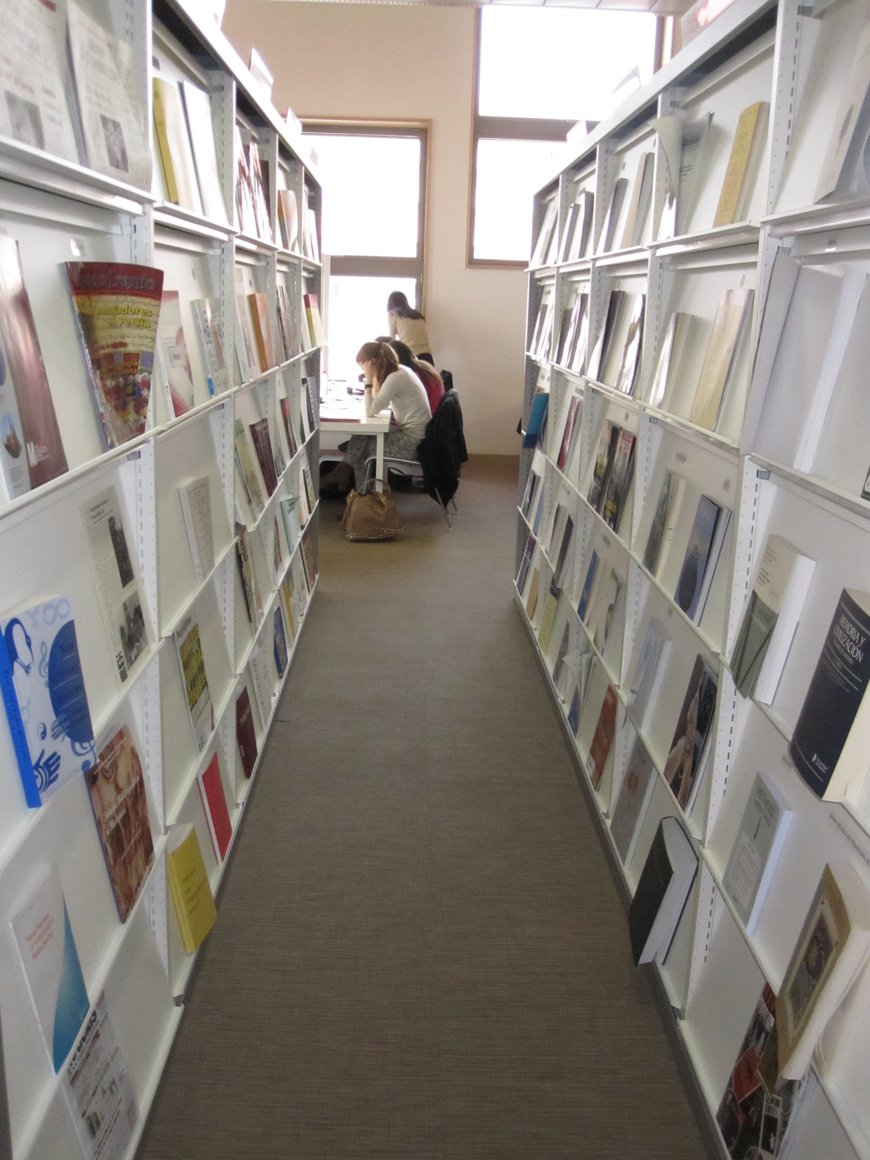 Perspectiva de las estanterías de revistas en la Biblioteca de Humanidades, Comunicación y Documentación en Getafe. Al fondo y en el centro de la imagen, grupo de alumnas estudiando.