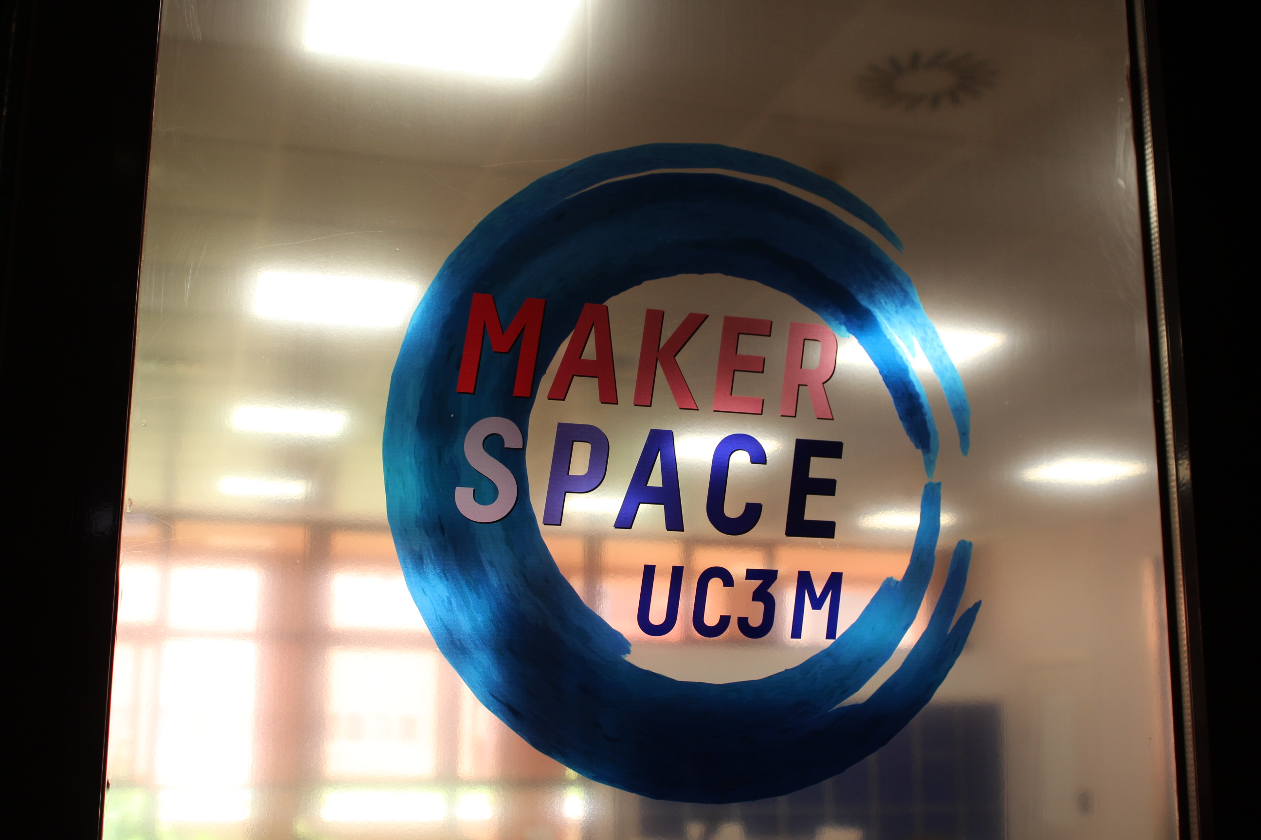 Logotipo o escudo del Makerspace UC3M en una cristalera de la Biblioteca de la Escuela Politécnica Superior en Leganés