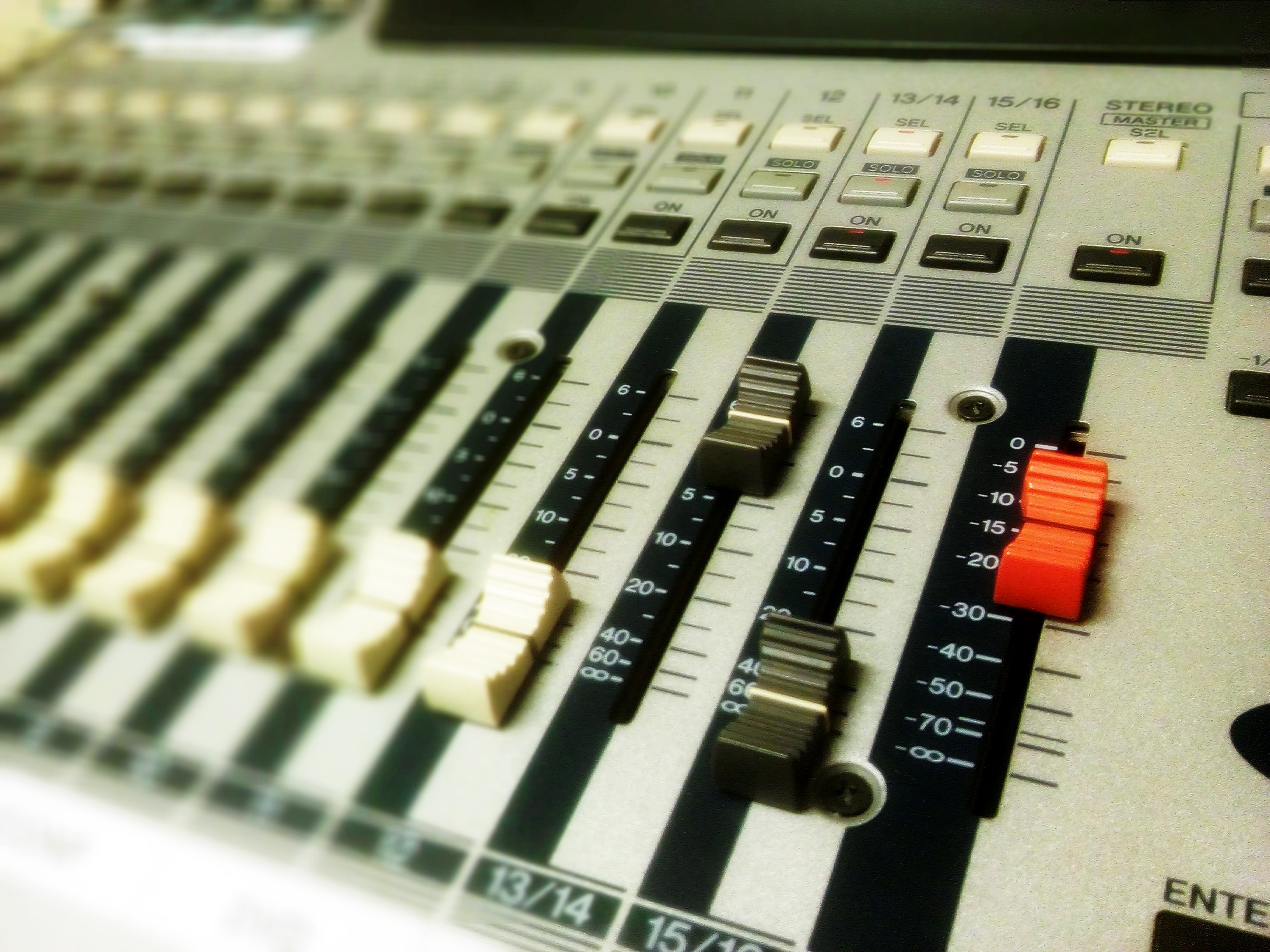 Detalle de los mandos de una mesa de mezclas de audiovisuales.