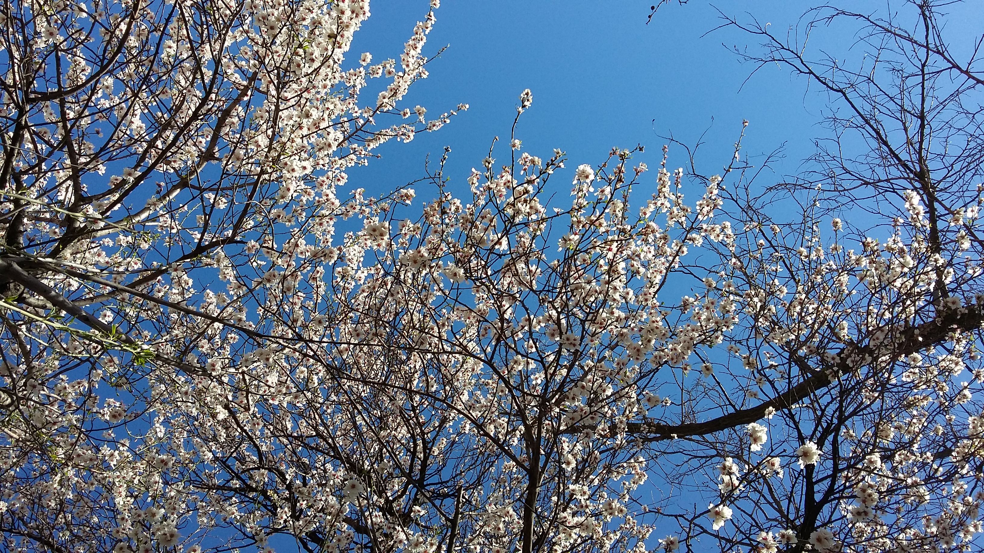 Ramas con flores blancas de almendro sobre cielo azul de primavera