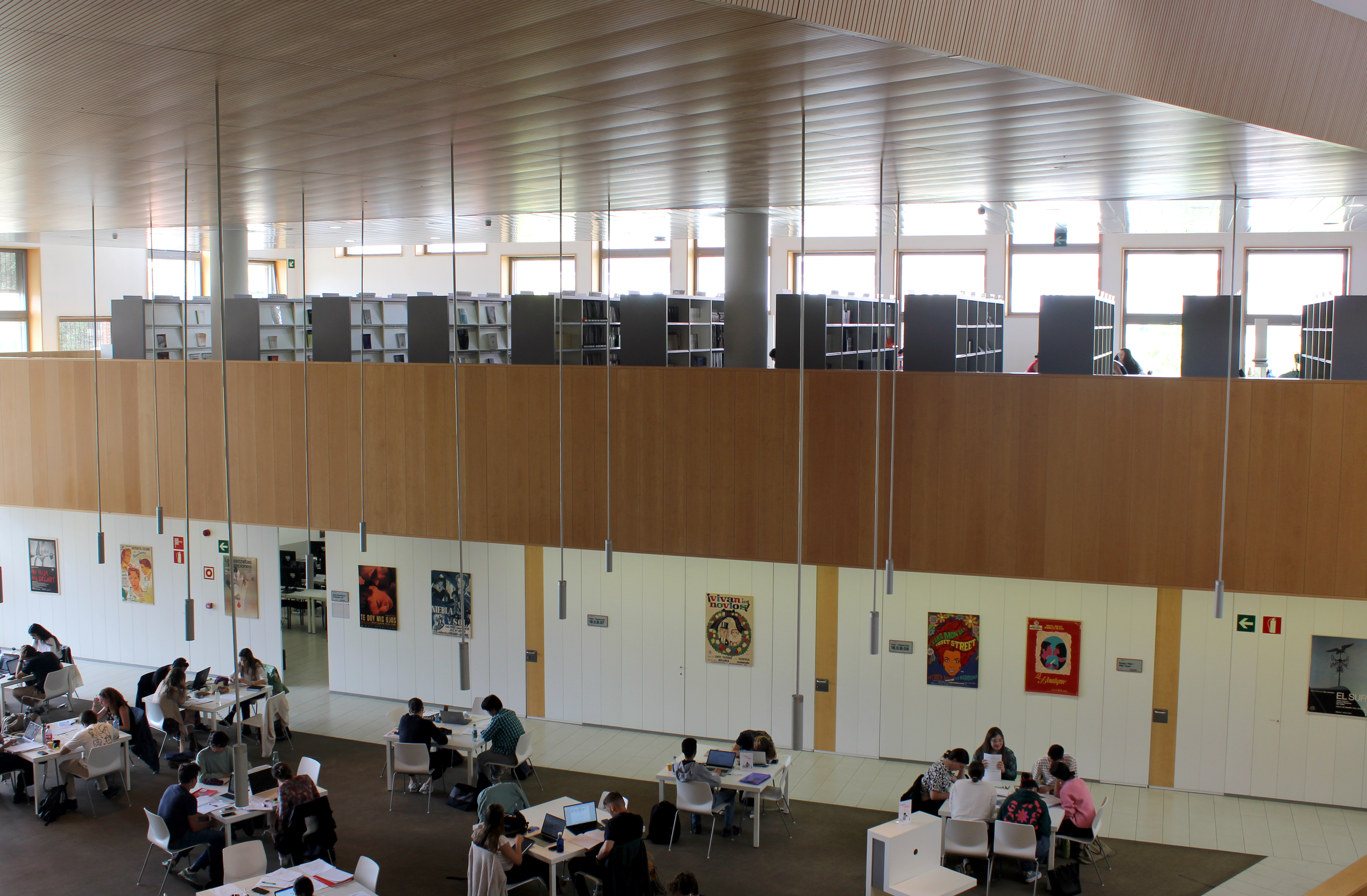 vista de sala de trabajo en grupo con estudiantes. Vista estanterías de fondo especializado. Biblioteca Humanidades getafe