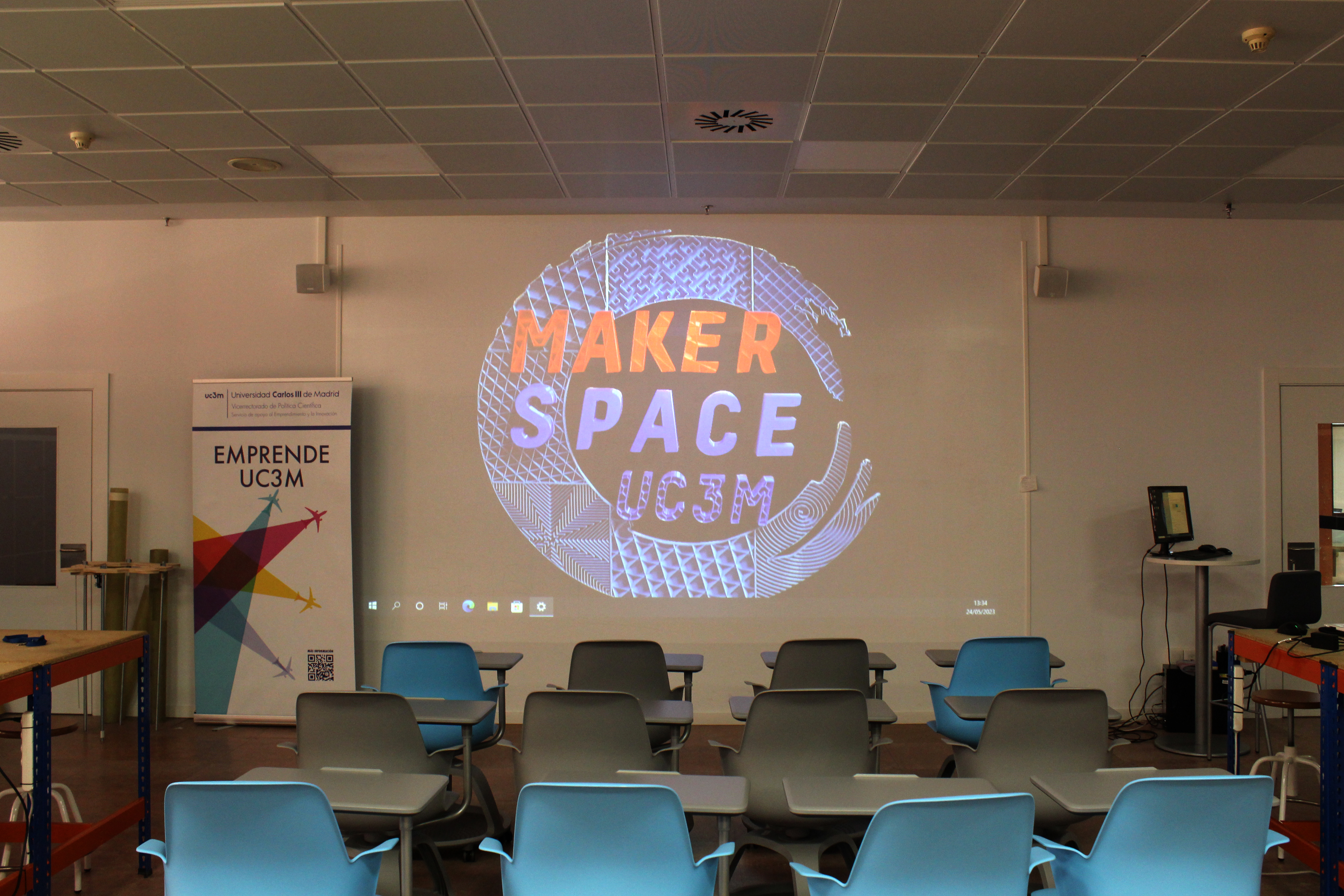 sala de presentaciones de Maker Space con logo proyectado