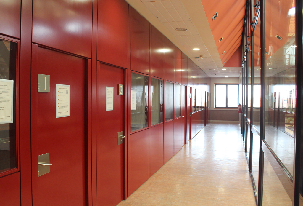 Pasillo exterior salas de estudio en grupo. Biblioteca Escuela Politécnica Superior