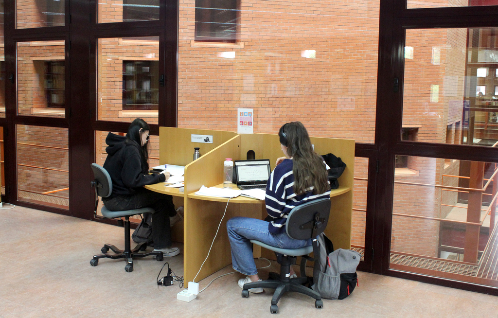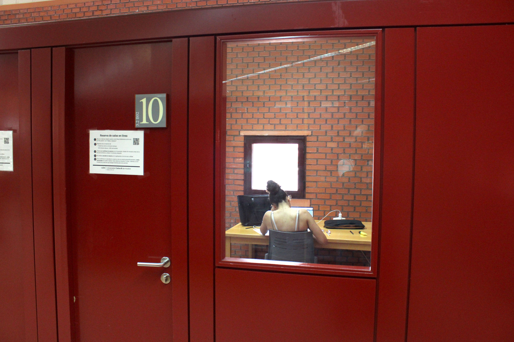 vista exterior sala de estudio individual con alumno .Biblioteca Escuela Superior Politécnica. Leganés -