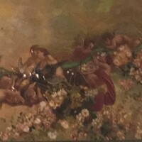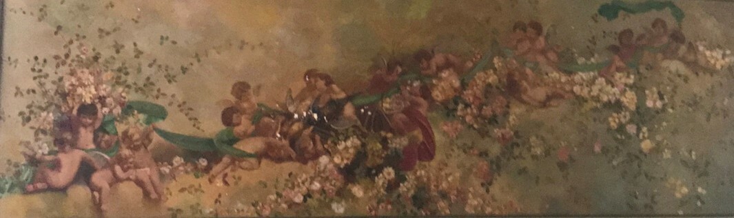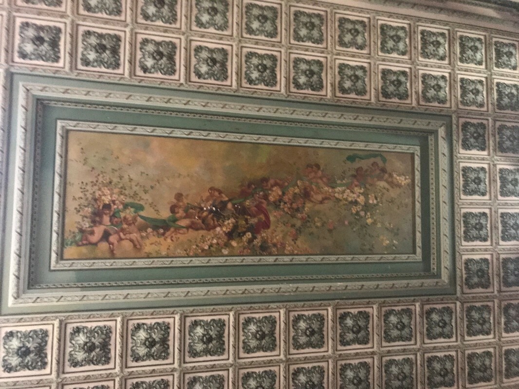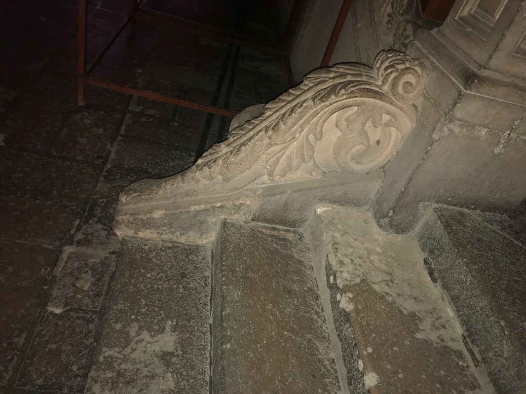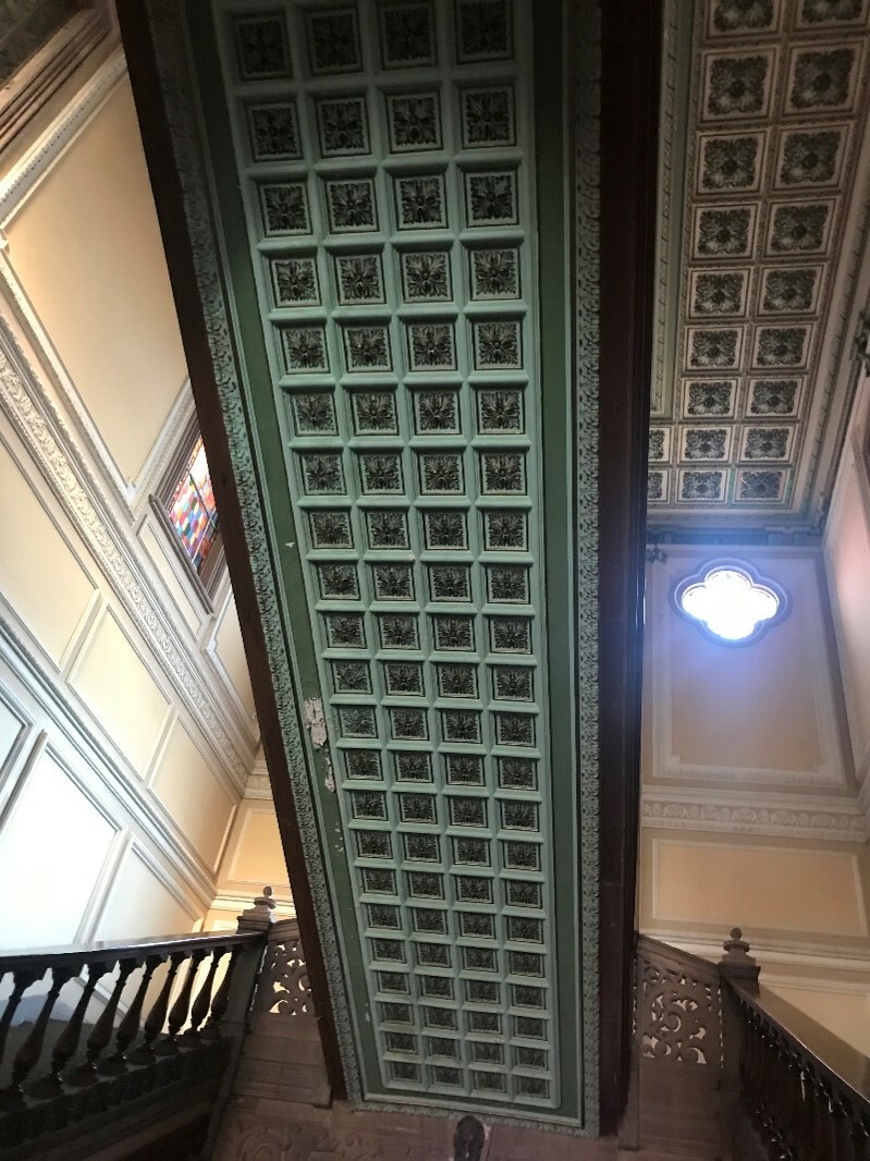 El tramo central de la escalera, que conecta a la planta alta, tiene dos barandales laterales de cantera rosa, su estructura la componen dos columnas —una en cada lado— y la parte central cuya decoración la forman hojas de acanto. La escalera en el techo tiene un plafón de 8.50 de ancho por 14 metros de largo, se trata de una pintura al óleo, realizada por Erulo Eroli, que el obispo Montes de Oca obtuvo, junto con otros trabajos, en uno de sus viajes a Roma. La escena la componen un grupo de querubines que forman una guía con un listón verde, palomas y flores blancas con ramas verdes. El lienzo está enmarcado por un elegante artesonado con tonos verdes, dorados y blancos, elemento que se repite en la parte inferior de la escalera.
