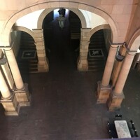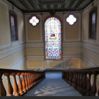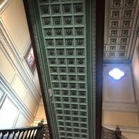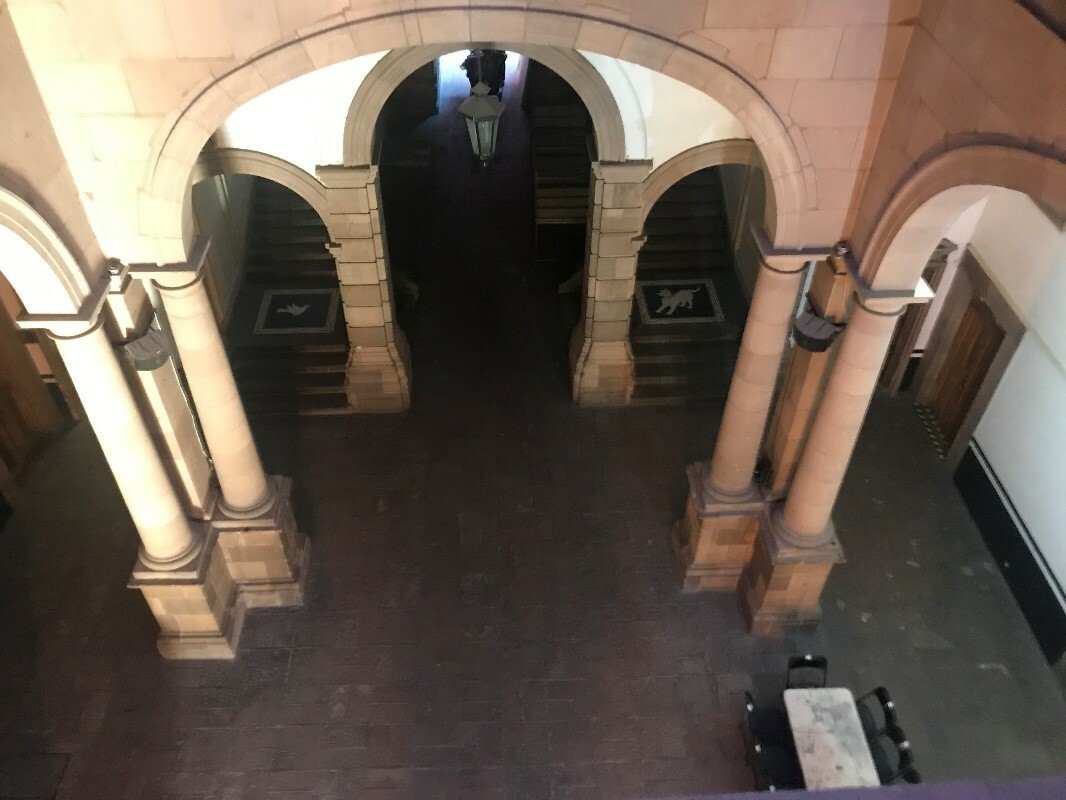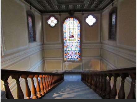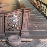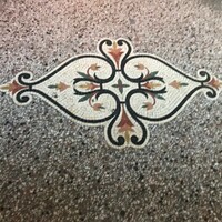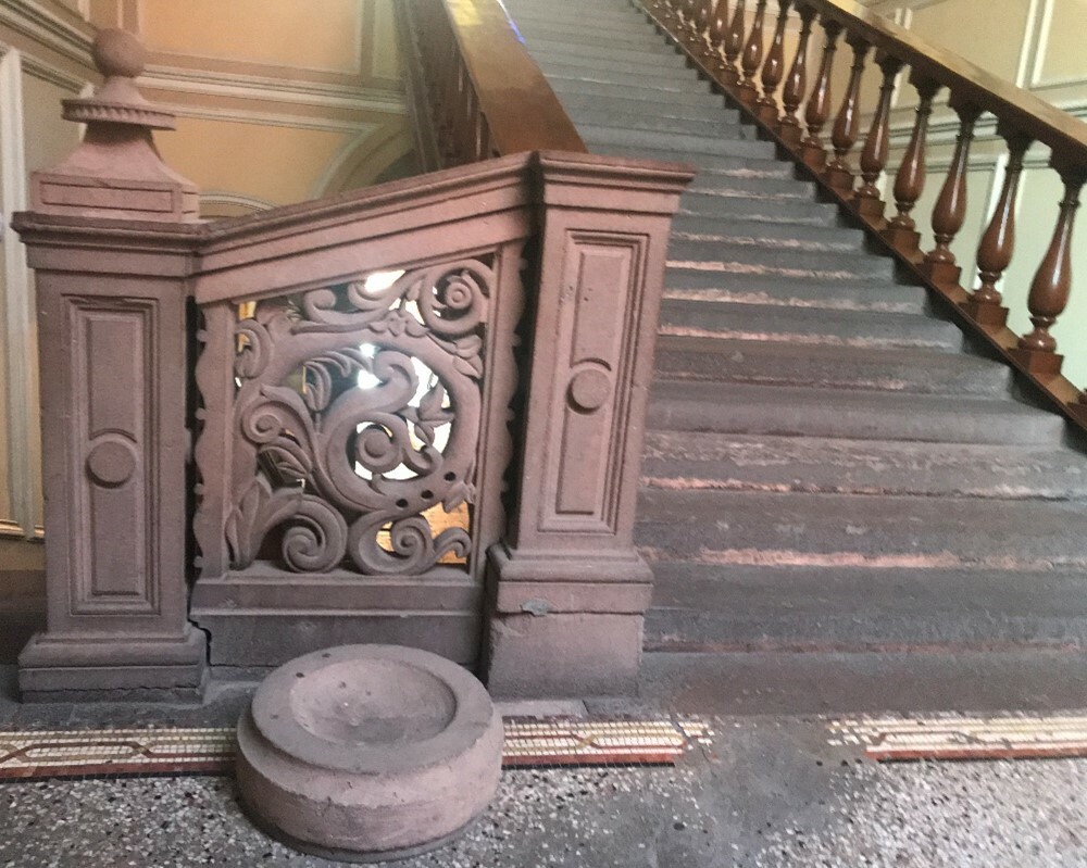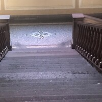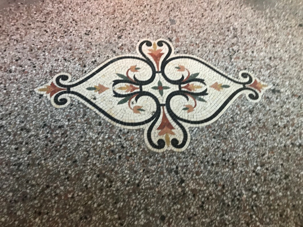 El segundo nivel de la escalera deriva en una sola rampa en cuyo descanso se encuentra en el centro del piso una figura policromática con motivos florales, elaborados con pequeños mosaicos en tonos rojo, negro y verde, inspirados en Pompeya; ahí mismo se encuentra un vitral que data de 1960 y representa el escudo de armas de San Luis Potosí.