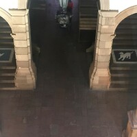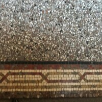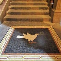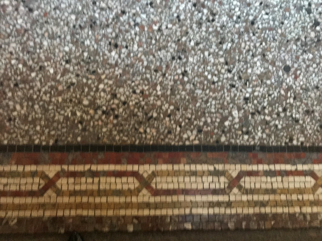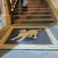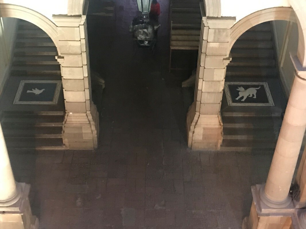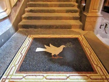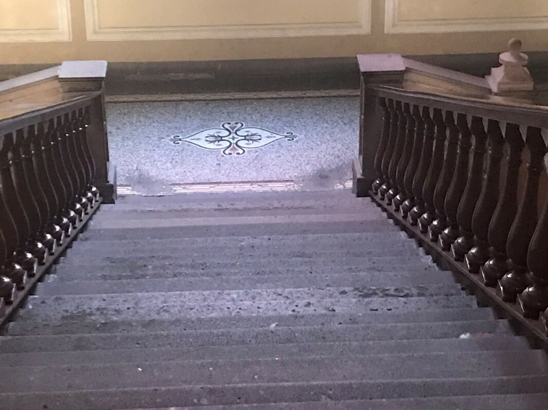 Contiene dos rampas laterales en cuyos descansos se encuentran las réplicas de mosaicos en estilo pompeyano, ambos con dimensión de 1.5 metros de alto por 2.5 de ancho. El mosaico que está al pie de la escalera del lado derecho representa al cave canem que se ubica en la Casa del poeta trágico en Pompeya; el que está al pie de la escalera del lado izquierdo presenta una paloma blanca con una rama de olivo en el pico, aunque no se ha podido determinar si esta misma imagen existe en alguna casa pompeyana, está elaborada con el mismo estilo del otro mosaico. Las dos figuras fueron realizadas en tonos blancos con fondos en negro y marcos policromado en rojo, verde y negro con entrelazados en las esquinas. Estas escaleras, al llegar al primer descanso, que es amplio, se continúan al centro en un solo tiro