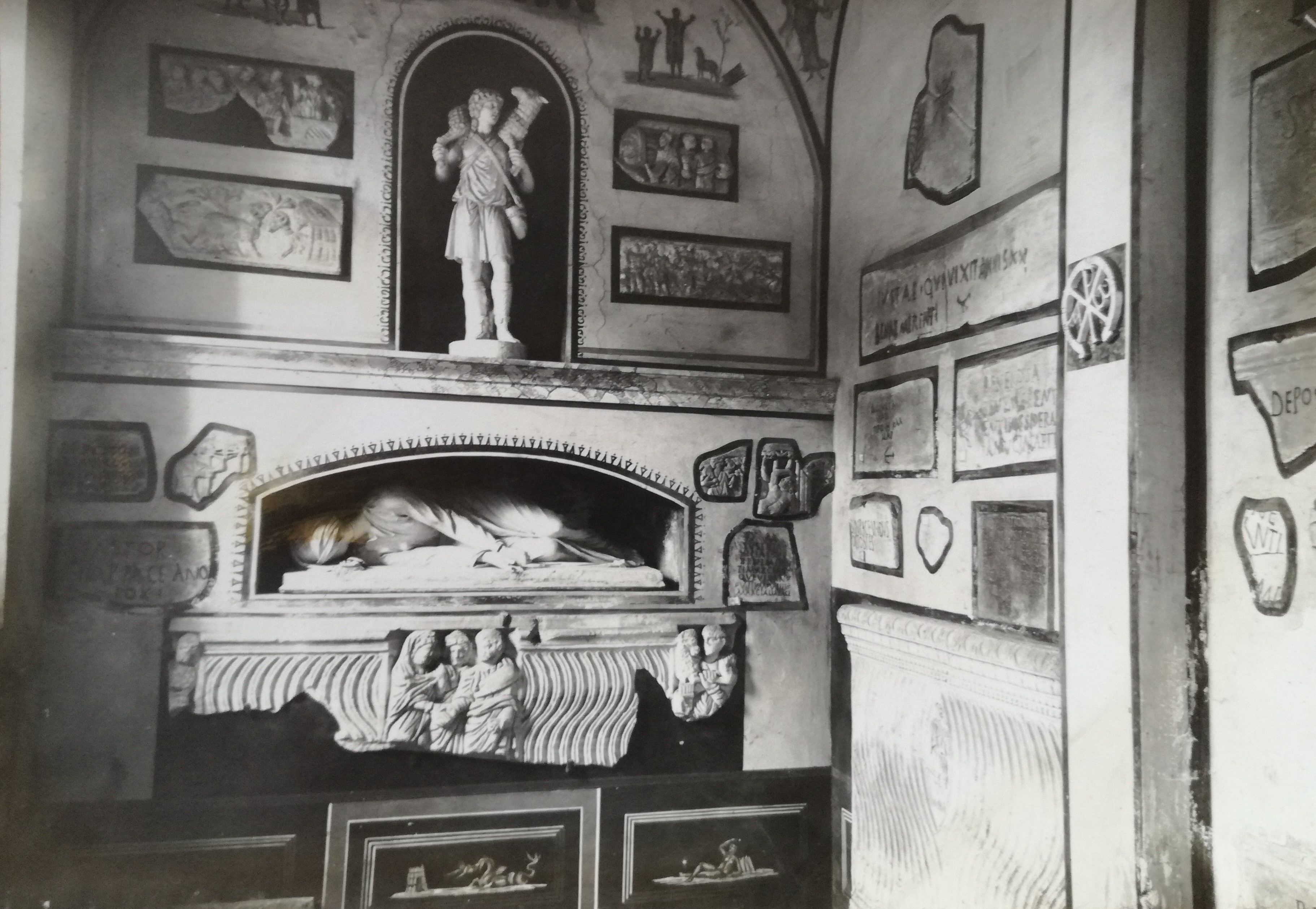 Shortly after the opening, de Waal planned to move the museum to the Damenstift. In 1885, he had the ground floor and a cellar rebuilt to open the new museum hall. In the basement rooms, a room in imitation of a double burial chamber of a catacomb was installed: it was a vaulted room decorated on the ceiling and walls with copies of catacomb paintings, inscriptions and sculptures embedded in the walls, lamps and terracotta were arranged in showcases. A small hypogeum then offered an imitation of a 'cubiculum duplex cum arcisoliis et luminare'. Some original photographs belong to this phase. The two basement rooms, all decorated with bands of red and green lines typical of the catacombs, were vaulted and connected by a short corridor, painted with motifs from the catacomb of Callisto. At the top and bottom of the walls and in the vaults, motifs and scenes from the catacombs of Callisto were copied. On the walls of the largest room were sarcophagi and numerous funerary inscriptions from the catacombs. Above one of the sarcophagi was an arcosolium niche with a copy of the statue of St. Cecilia by Stefano Maderno and, above it, another niche with a copy of the statue of the Good Shepherd from the Lateran Museum.