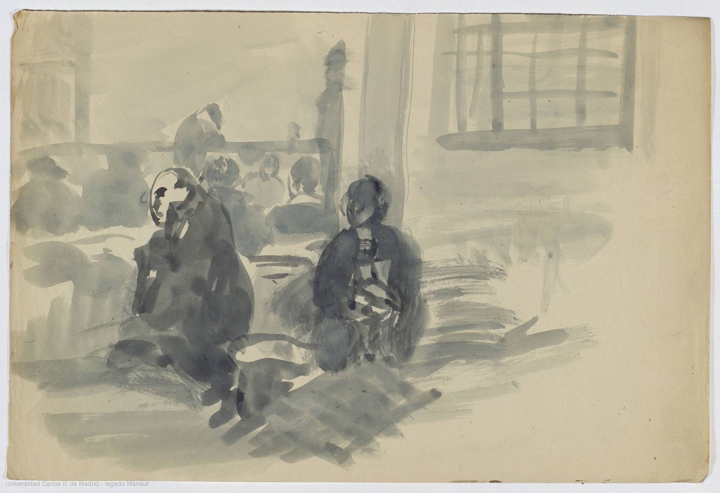 VARIOS EN GALERÍA, con ventanal a la derecha - Aguada gris verdosa - 22 x 32 cm