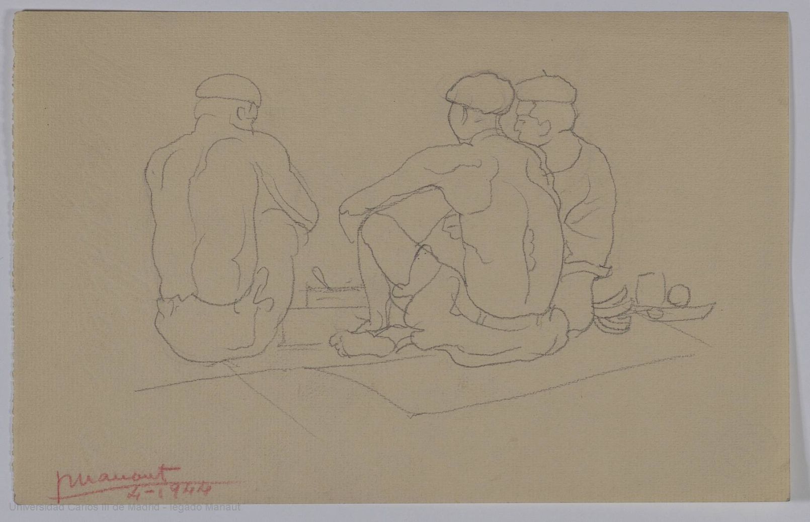 TRES SENTADOS EN CORRO, con torso desnudo - Grafito - 14 x 22 cm - Firmado en rojo: J. Manaut, 4-1944