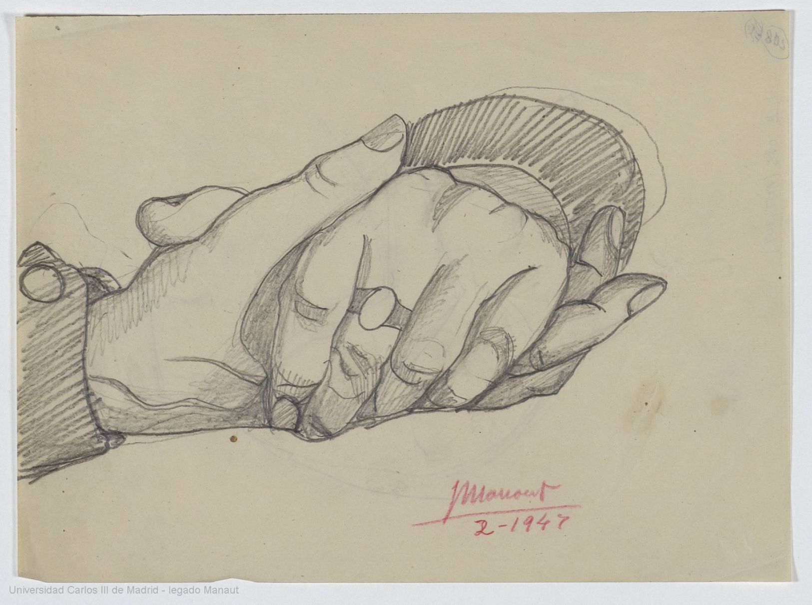MANOS ENTRELAZADAS - Grafito - 16 x 22 cm - Firmado en rojo: J. Manaut, 2-1944 - REVERSO: Bosquejo de uno sentado, leyendo - Grafito