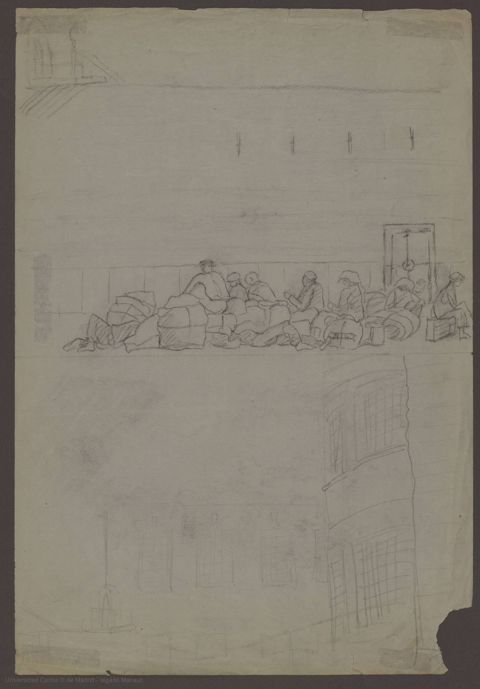 VARIOS SENTADOS EN PETATES, y ventanas enrejadas , mitad y mitad - Grafito - 32 x 22 cm