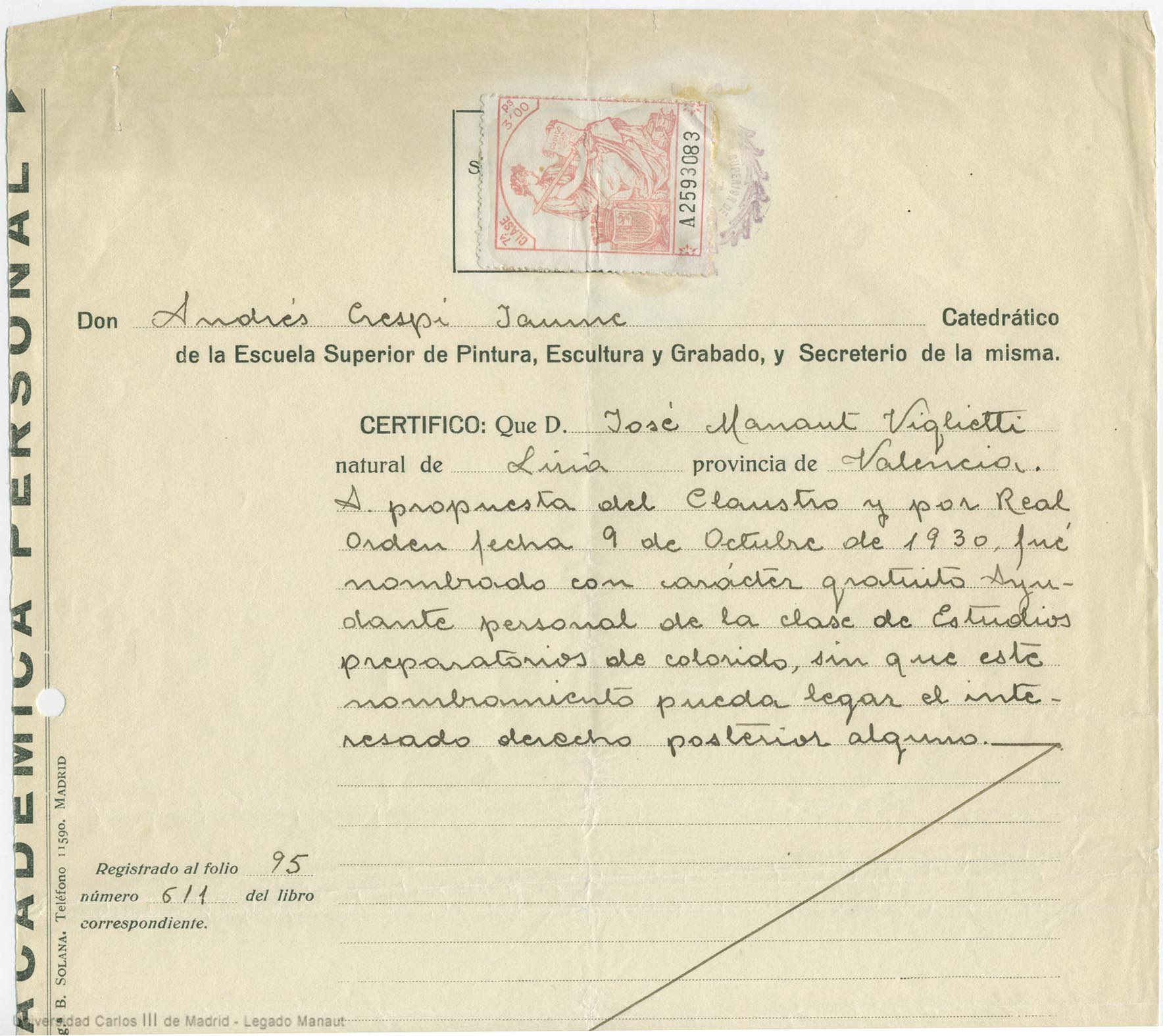 Nombramiento como Ayudante de la clase de Estudios preparatorios de colorido en la Escuela Especial de Pintura, Escultura y Grabado de Madrid (9 de octubre de 1930)