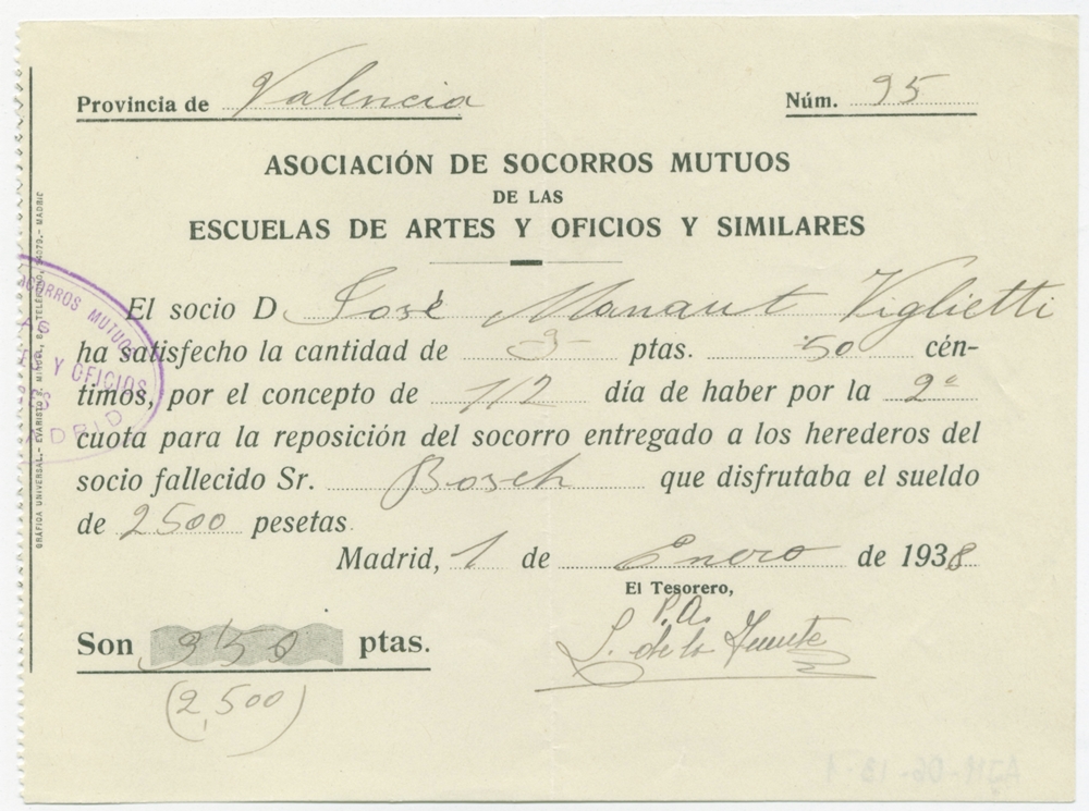 Recibo de la Asociación de Socorros Mutuos de las Escuelas de Artes y Oficios y Similares. Firmado por Luis de la Fuente
