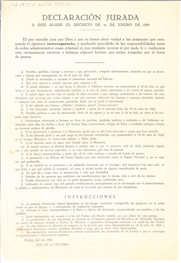 Impreso de Declaración Jurada a que alude el Decreto de 21 de enero de 1939, por el que se compromote a decir la verdad en el interrogatorio
