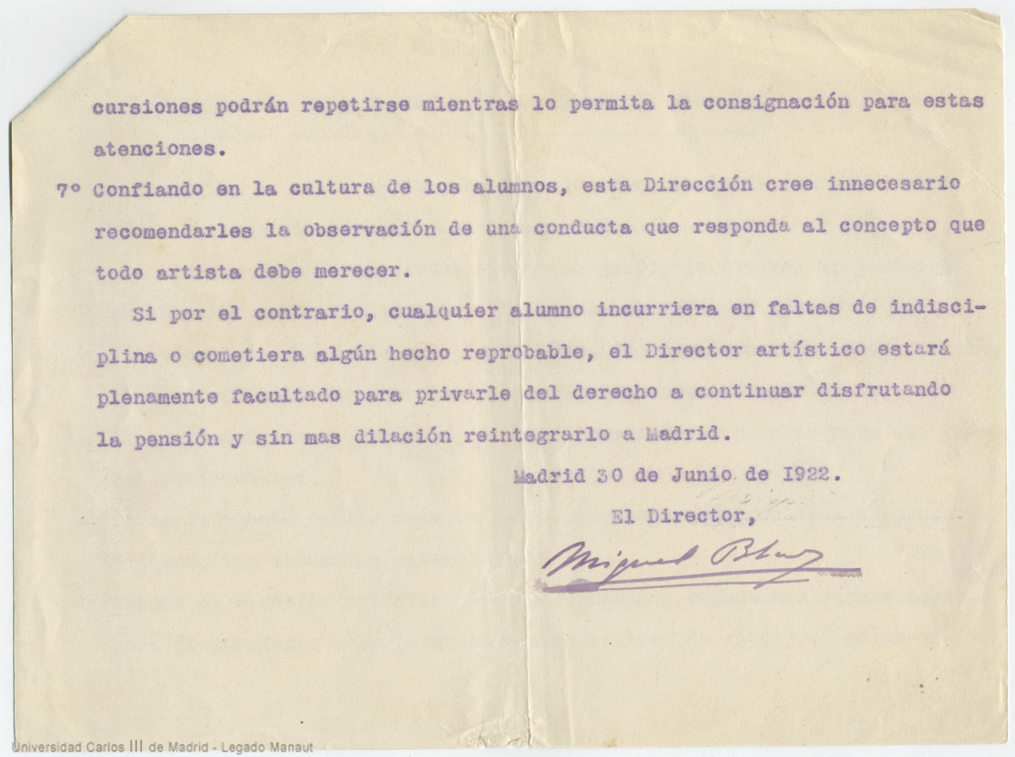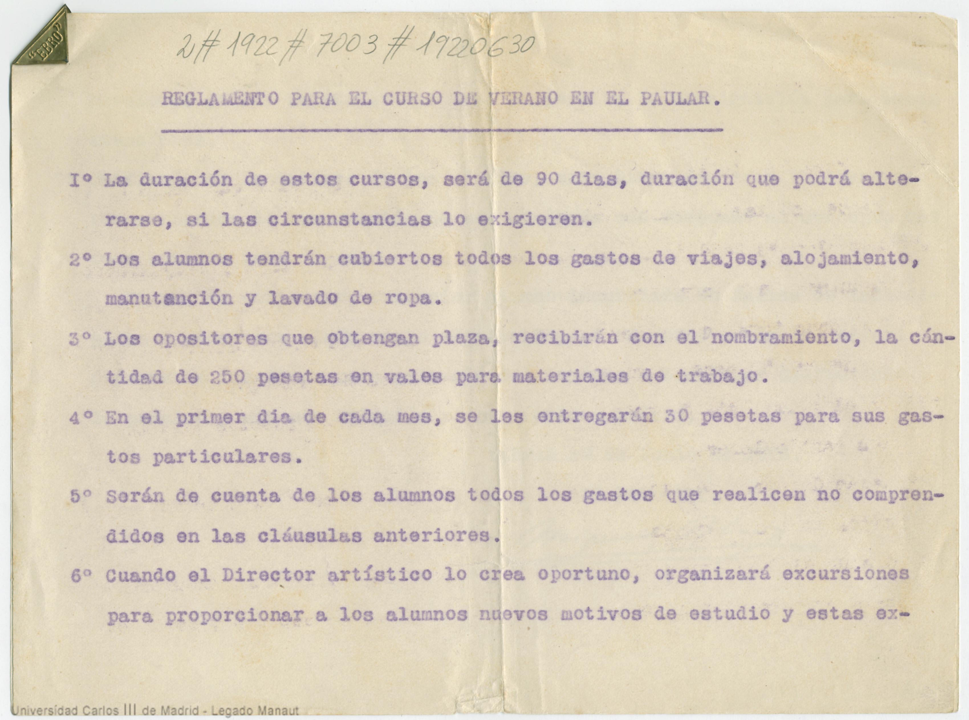 Reglamento para el Curso de Verano de El Paular. Firmado por Miguel Blay