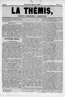 La Themis fue una revista semanal. La belleza de su nombre para una publicación jurídico-periódica no fue una iniciativa precisamente original. La par francesa existió desde 1819 hasta 1831 bajo el nombre “Thémis ou Bibliothèque du jurisconsulte, par une réunion de magistrats, de professeurs et d’avocats”, editada en París por Blondeau, Antoine Marie Demante, Athanase Jourdan, Leopold Warnkönig, entre otros y fue una sólida tribuna para intentar dar un espacio a la Escuela Histórica en Francia. La publicación española nació en 1857 con el título La Themis: revista de jurisprudencia y administración, tenía una frecuencia semanal y el director propietario fue Don Vicente Morales Díaz, «juez de primera instancia cesante». La Themis se planteó como una continuación de la antes citada La Justicia de 1855, pero con otra planta, tamaño y director,...