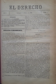 El n.1 (8-3-1886) se abre con un artículo de la Redacción titulado “Nuestro Pensamiento”, en que se lee: “Abrir las columnas de El Derecho á cuantas personas se dedican á los estudios jurídicos, y en donde los jurisconsultos puedan tratar los diferentes problemas que la ciencia del Derecho encierra, y en donde los alumnos puedan a su vez hacer sus primeros ensayos; dar á conocer las disposiciones legislativas más importantes; la Jurisprudencia del Tribunal Supremo y especialmente la de las Salas de ésta Audiencia, cuyo último conocimiento es de gran conveniencia para la localidad; tener al corriente á nuestros lectores del movimiento científico, indicando las obras, monografías y revistas de Derecho que vayan apareciendo, no solo en España, sino también en el extranjero; y por último publicar los programas y las explicaciones de los profesores en...