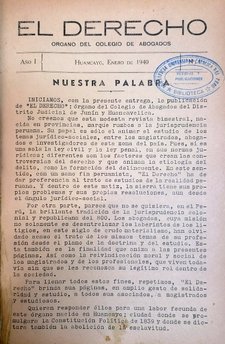 En enero de 1940 apareció la revista El Derecho, Órgano del Colegio de Abogados de Junín. Fue fundada por el Dr. Federico Gálvez Durand con el objetivo de “animar el estudio de los temas jurídicos-sociales, entre los magistrados, abogados e investigadores de esta región del país”. Además de otros acontecimientos históricos, El Derecho pretendía situarse en continuidad con los procesos de reforma que definieron el Perú moderno. Ciertamente, en Huancayo, capital del departamento de Junín, el presidente Agustín Gamarra promulgó la Constitución en 1839, tras el fracaso de la Confederación formada entre Perú y Bolivia, y en 1854, el presidente Ramón Castilla decretó la abolición de la esclavitud. La publicación se presenta “con un sano fin peruanista”, planteando construir un Derecho peruano inspirado en la ley escrita, en diálogo con la diversidad...