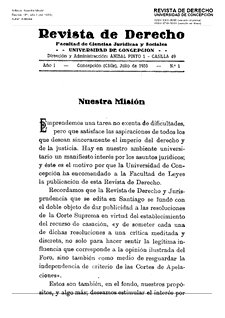 La revista nace en torno a la Facultad de Derecho de Concepción seguramente tras la reorganización de los estudios jurídicos en aquella universidad en 1929 y actualmente se considera la más antigua entre las revistas jurídicas que se publican en Chile. En el editorial del primer número se menciona a la “Revista de Derecho y Jurisprudencia” que se editaba en Santiago como ejemplo a seguir por esta nueva publicación creada también para dar publicidad y someter a críticas las decisiones de la Corte Suprema. Aunque la sección de jurisprudencia es importante, en todos los números hay una serie de artículos que abordan temas de interés, así como una sección dedicada a “Libros y Revistas”, y con frecuencia otra de “Notas bibliográficas” o de “Revista de revistas”, suele concluir con un apartado de “Leyes y Decretos” que daba cuenta de nuevas...
