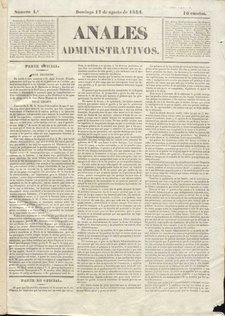 “Se ha dignado resolver S. M., que en los Anales Administrativos, que será el título del nuevo periódico, que saldrá á luz bajo los auspicios del Ministerio de mi cargo, se publiquen con la posible estension y exactitud las sesiones délas Cortes en ambos Estamentos; los Decretos y Reales órdenes de interes público que se espidan por el ministerio de lo Interior, y las demas cuya publicación juzguen oportuna los otros señores secretarios del Despacho; noticia de los adelantamientos en los diferentes ramos de la administración pública, con arreglo á las comunicaciones de los gobernadores civiles y demas autoridades de las provincias; las de las mejoras en la agricultura, artes y comercio en los paises estrangeros; los principios de la ciencia de la administración, tan importantes para la felicidad de los pueblos, como sesgraciadamente poco conocidos hasta...