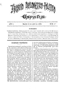 Descripción física, 1 v.; 23 cm. El primer número del “Archivo Diplomático-Político”, es de 15 de abril de 1883. A partir de enero de 1884, pasa a ser el “Archivo diplomático de España” y une el subtítulo, que explica su nuevo contenido. A partir del 15 de agosto de 1855, completará el título y será el archivo diplomático y consular. Se indicaba entonces que se hacía cargo de la dirección el periodista y cónsul Manuel José Quintana y Brodett, al que siguió Enrique Hernández.